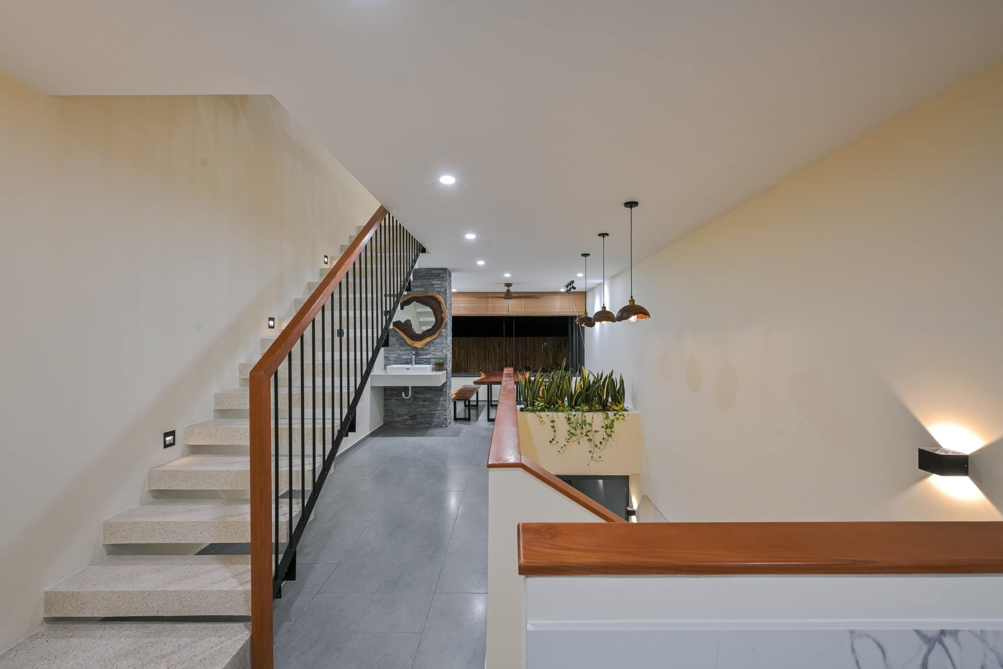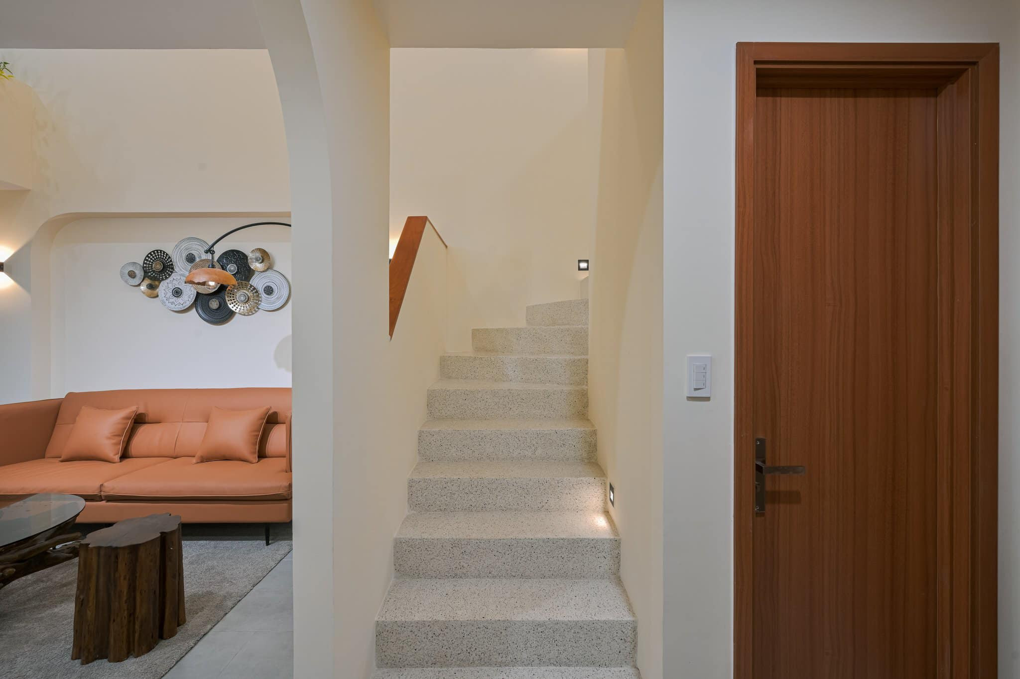 Cầu thang bê-tông lát đá mài trắng có độ nhám, giảm trơn trượt.