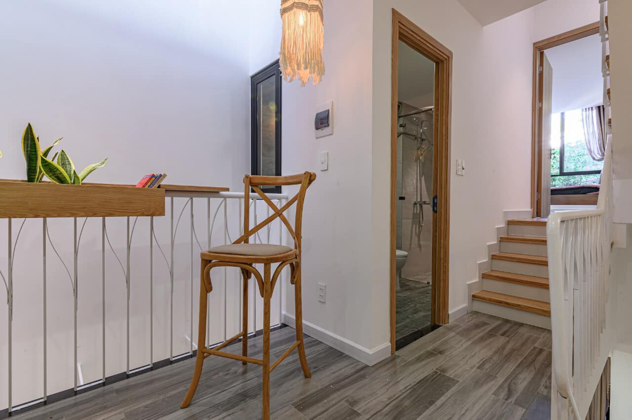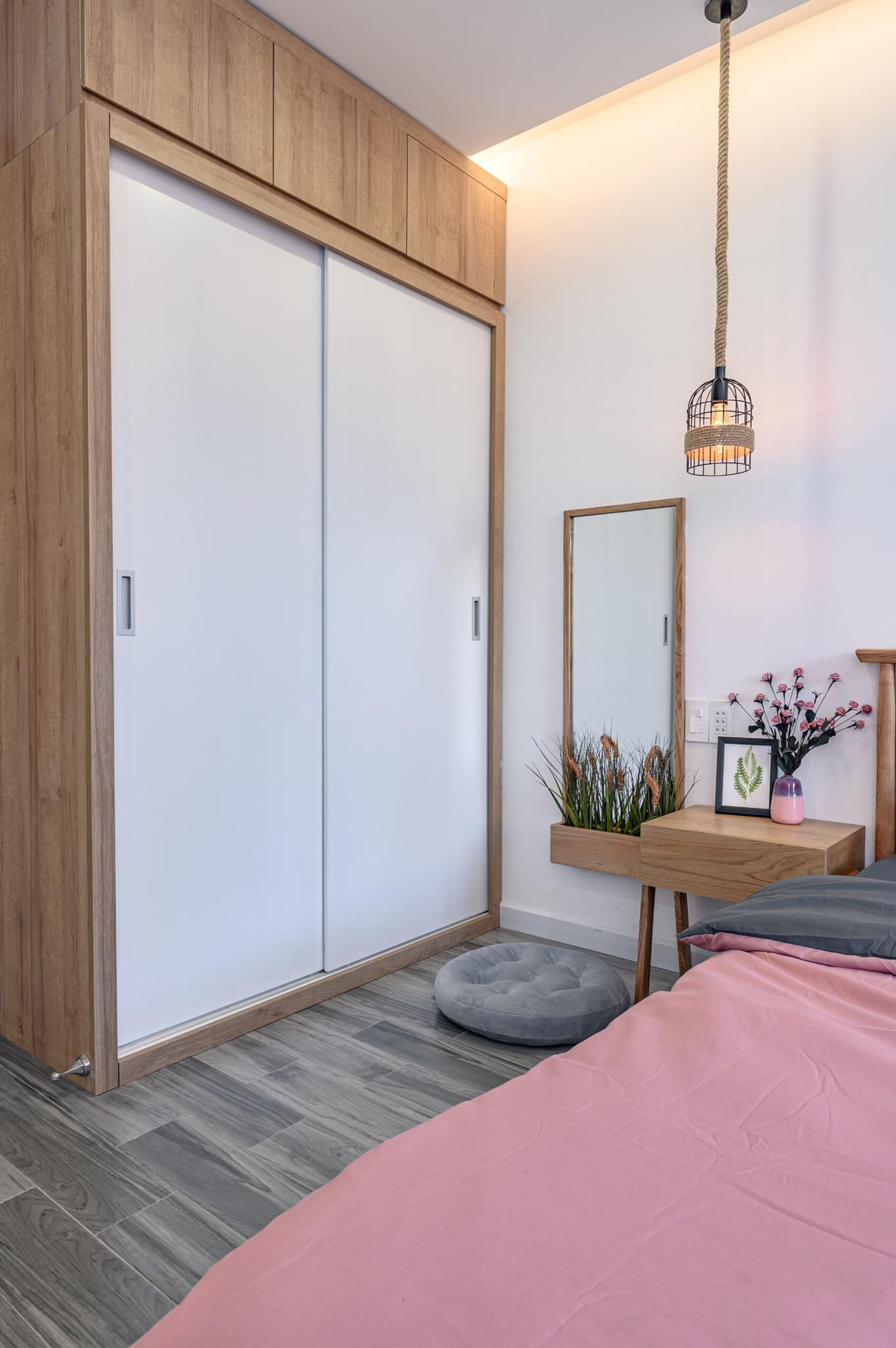 Phòng ngủ hai mặt thoáng nên trong lành và mát mẻ. Phong cách mộc, tối giản giúp không gian thêm rộng rãi, dễ chịu.