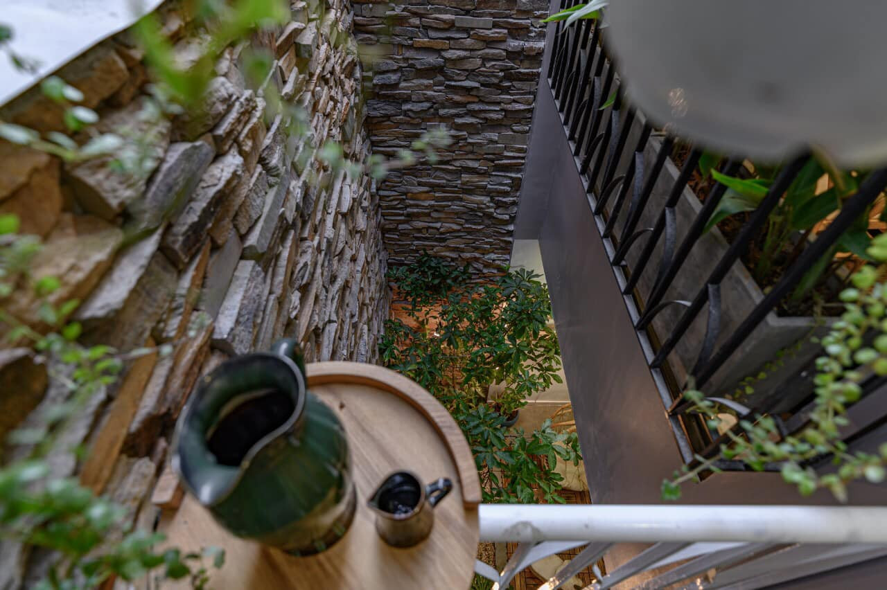 Sảnh cầu thang dưới giếng trời là góc nhâm nhi tách trà của vợ chồng gia chủ.