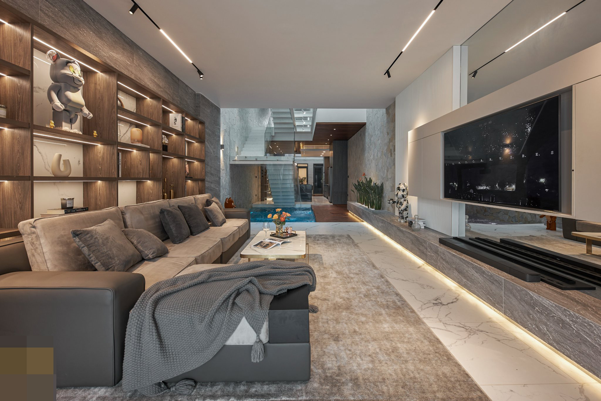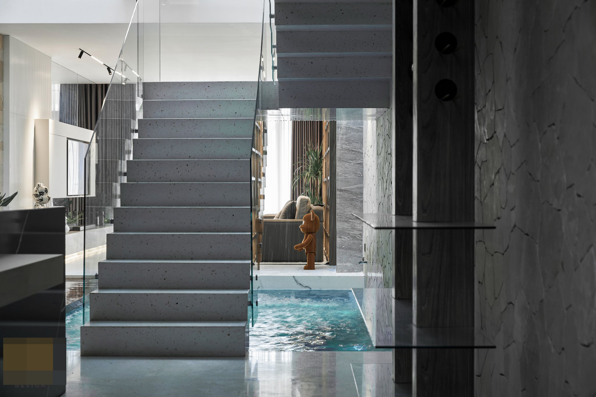 Bể bơi điều hòa với thác nước chảy róc rách, làm dịu không gian.