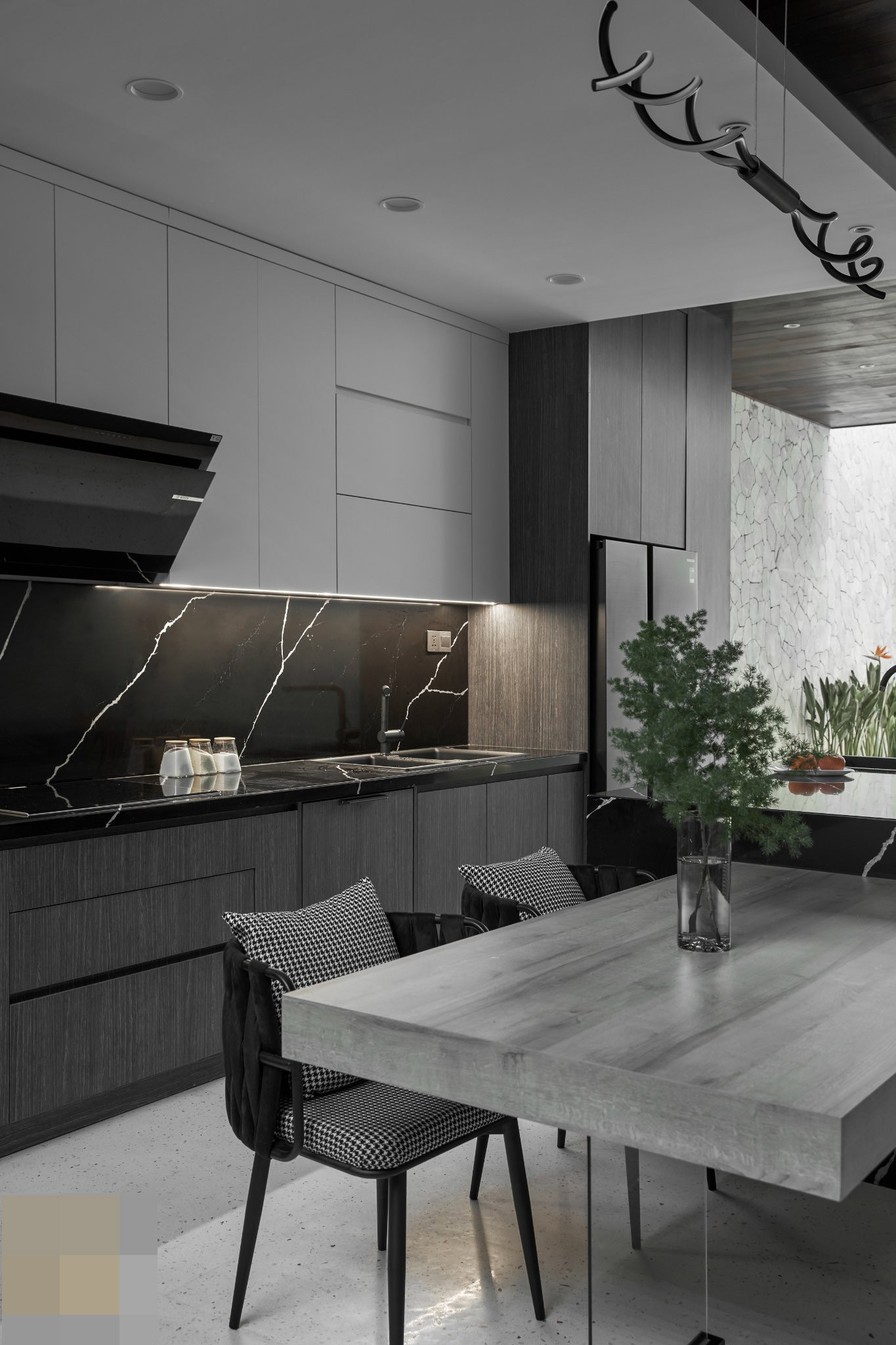 Bếp màu đen tinh tế, mảng tường ốp đá rối màu sáng đẹp mắt. Hệ thống ánh sáng bố trí nghệ thuật, chiếu sáng và làm đẹp không gian.