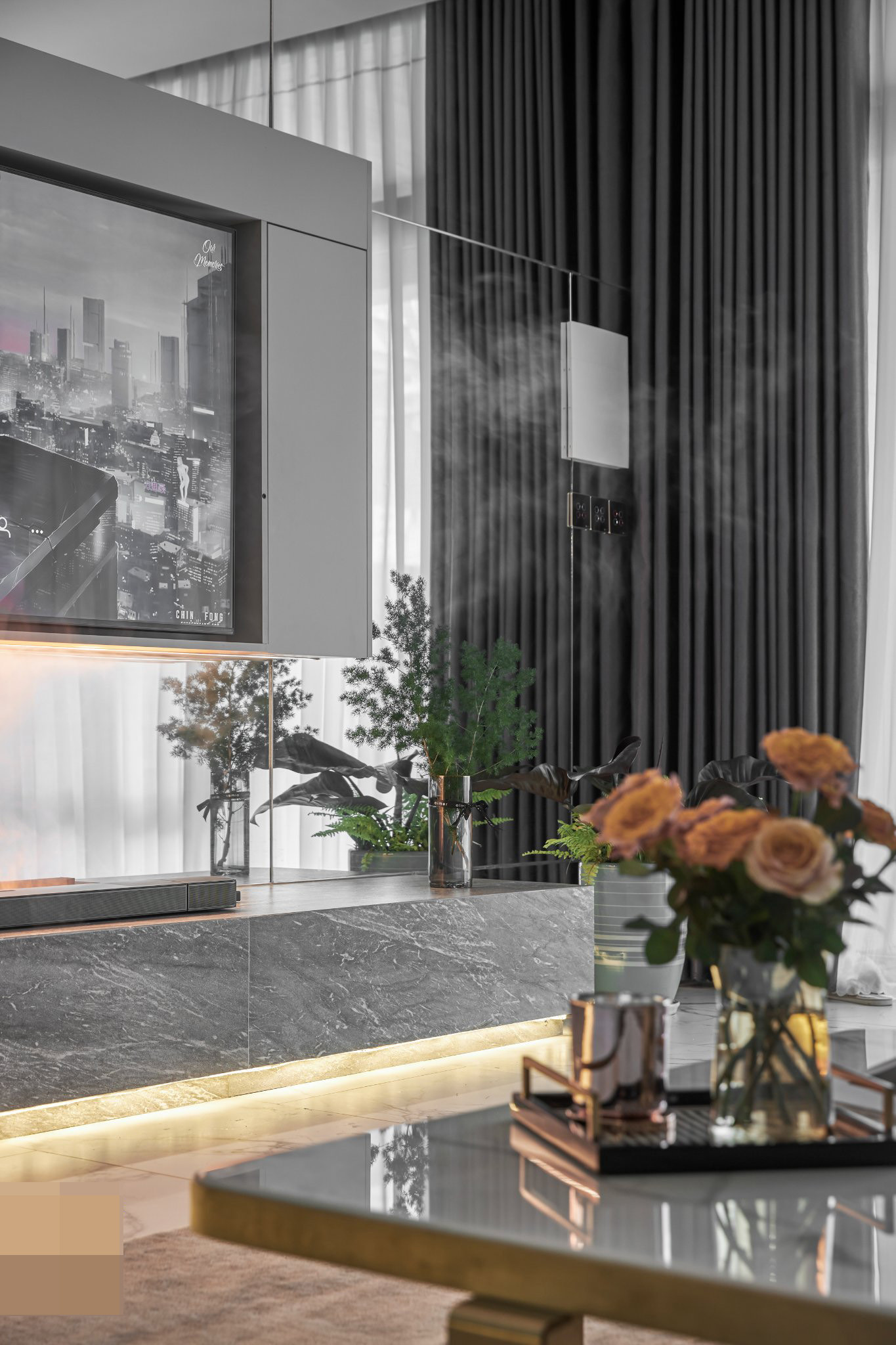 Phòng khách tone trầm, tối, nổi bật trên sắc trắng của ngoại thất.