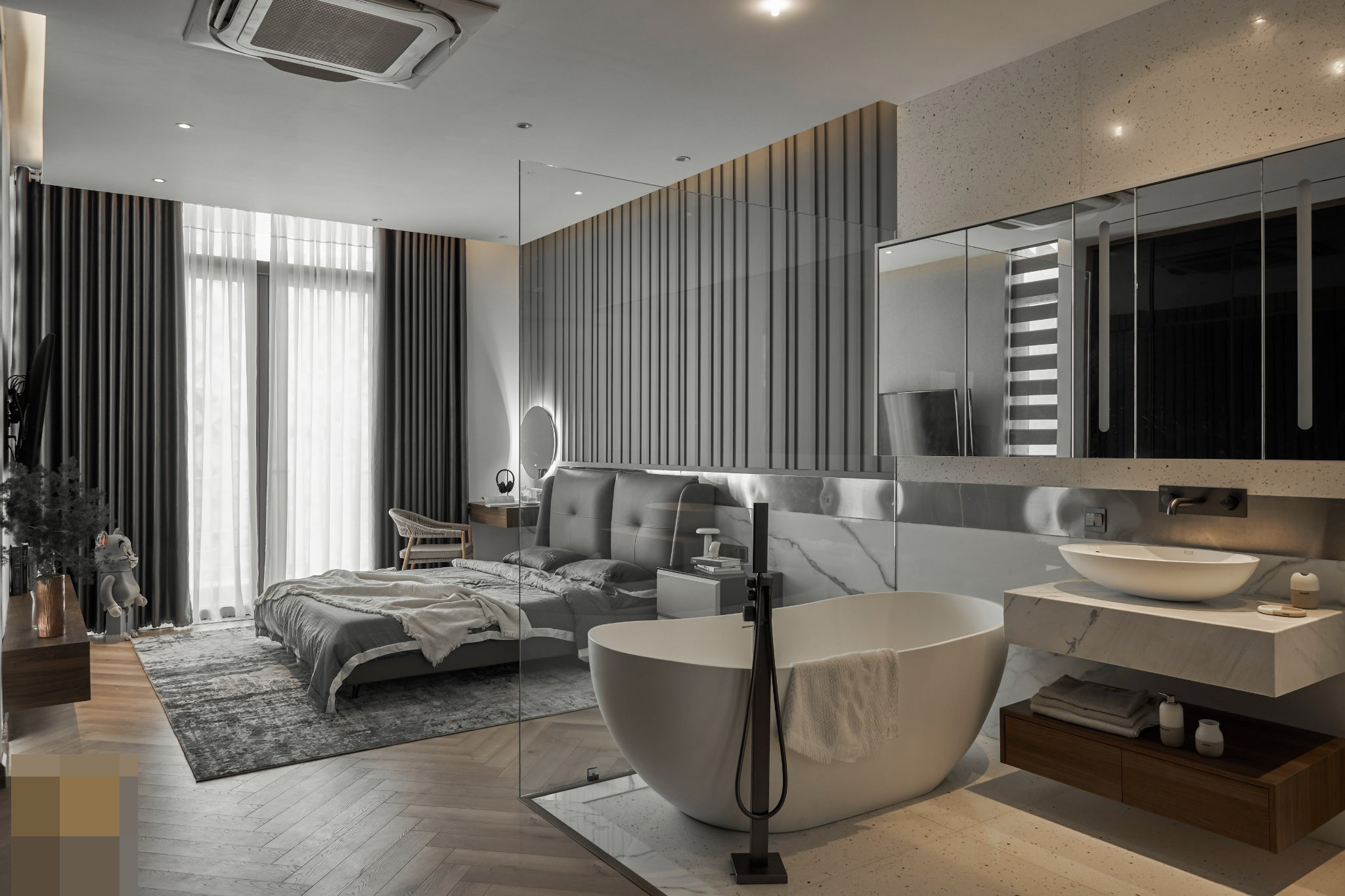 Phòng ngủ thiết kế mở với khu vực bồn tắm, bồn rửa mặt nằm trong một không gian, chỉ ngăn bằng tấm kính mỏng.