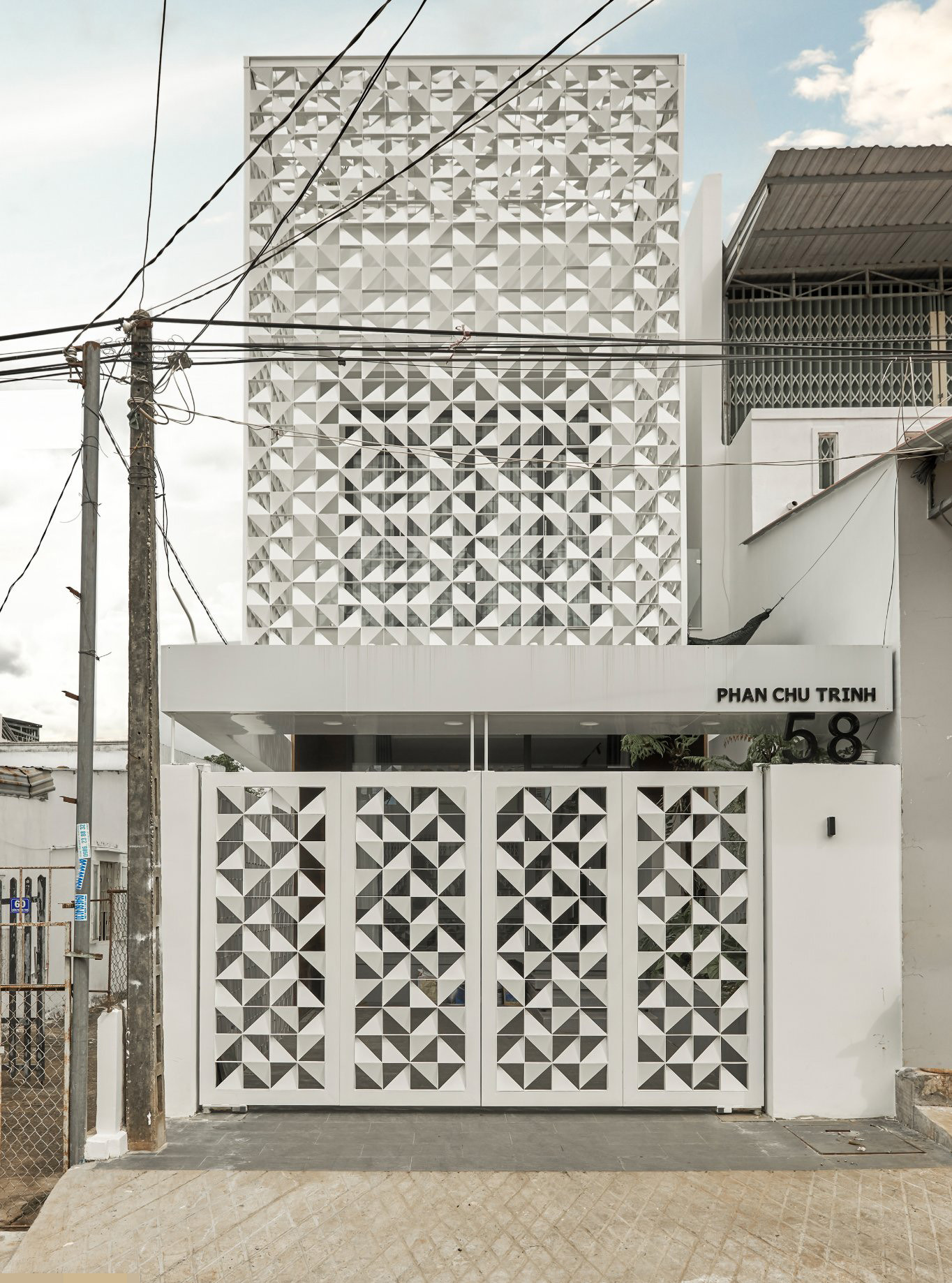 Bên trong và bên ngoài ngôi nhà. Lớp "áo giáp sắt" tạo điểm nhấn độc đáo, chống trộm và tạo độ mở vừa đủ với bên ngoài thông qua các lỗ thoáng.