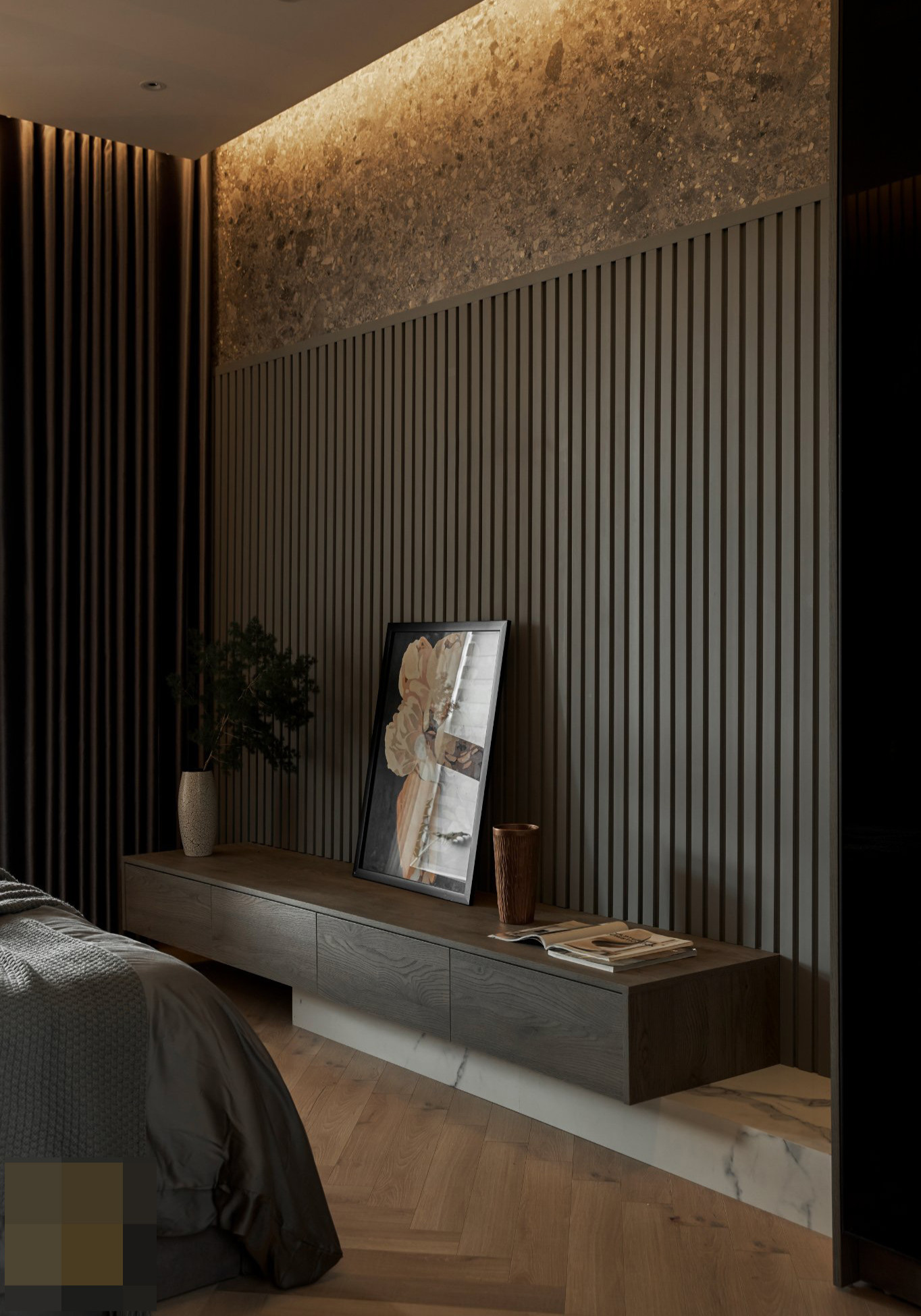 Phòng ngủ này dùng đá rối ốp khá lạ mắt, khác biệt hẳn so với các công trình mang tính "đại chúng" là sơn phủ.