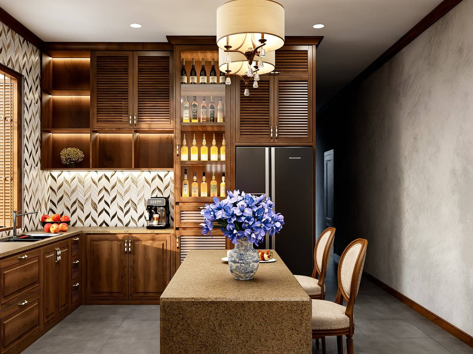 Tủ bếp được làm từ gỗ thịt màu nâu trầm liên kết với tổng thể ngôi nhà.