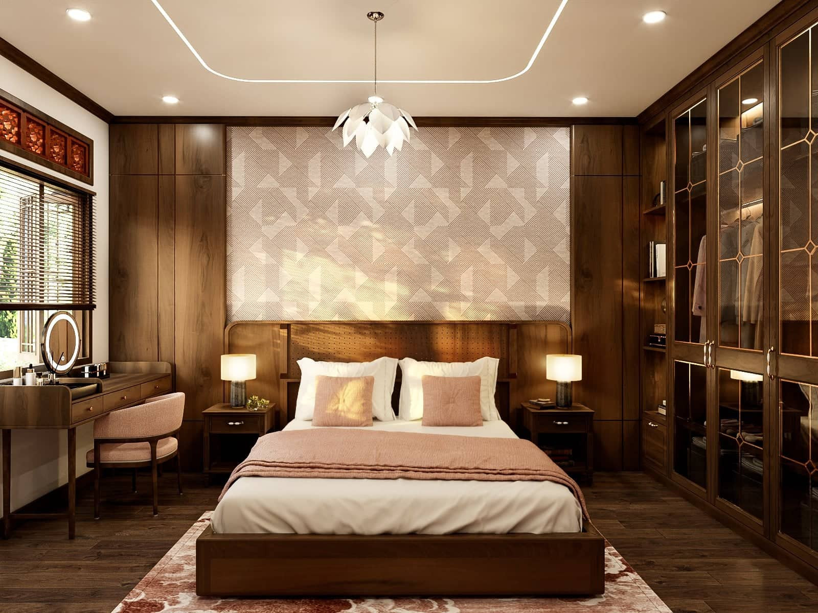 Phòng ngủ chính là nơi quan trọng nhất mang tới sự thư giãn thông qua những giấc ngủ sâu. Các phòng được bố trí đầy đủ tiện nghi với sự phối hợp các gam màu nâu, chêm thêm ánh sáng vàng nhẹ tạo nên không gian sang trọng, tình cảm giúp gia chủ luôn an lạc và thư thái.