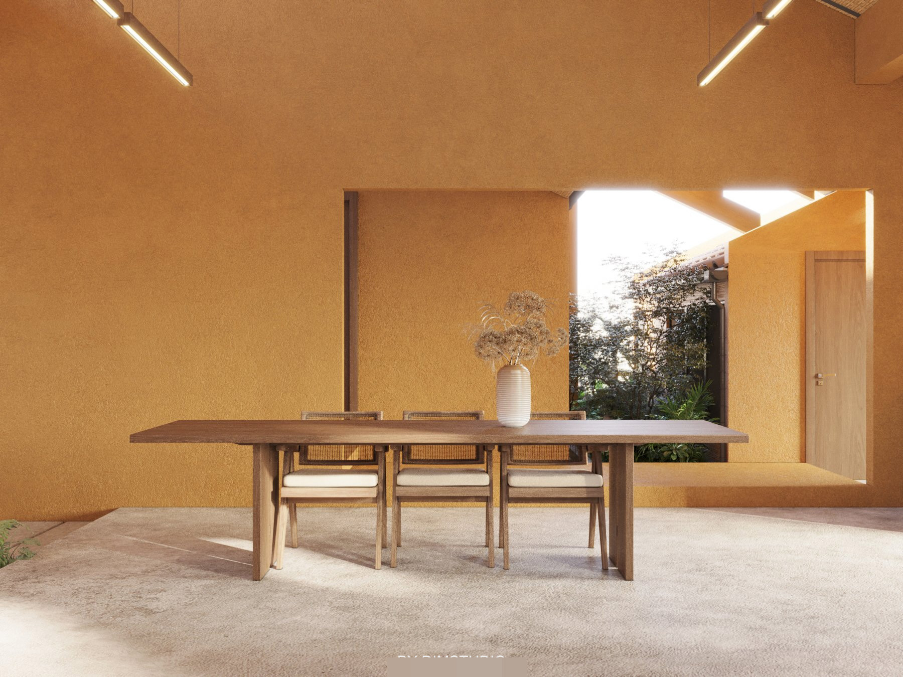 Vật liệu chính được anh Long chọn là tường sơn vàng và bê-tông nhằm tập trung vào sự mạch lạc của không gian và ánh sáng.