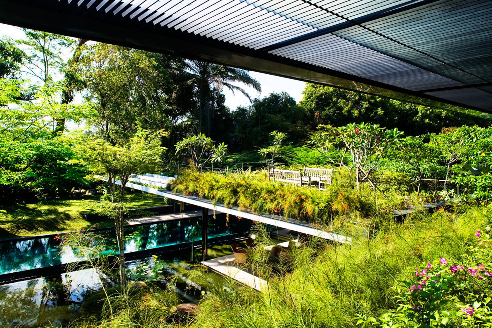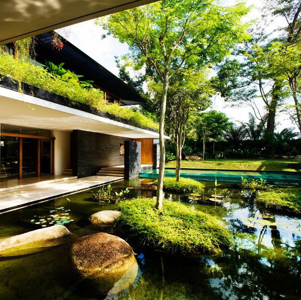 Trung tâm của ngôi nhà là hồ nước, những khu vườn tươi tốt trên mái nhà bao quanh hồ nước làm tăng thêm cảm giác thiên nhiên hiện diện ở mọi nơi trong ngôi nhà. |