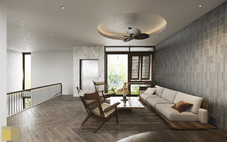 Tầng 1 bố trí bếp, bàn ăn, khoảng thông gió, phòng khách chính. Tông màu gỗ tối nhấn nhá với màu kem, be, xám và trắng không bị nặng nề, u ám nhờ cách phối khoa học, theo tỷ lệ cân đối. Từ phòng bếp có cầu thang dẫn lên tầng lửng và các không gian khác.