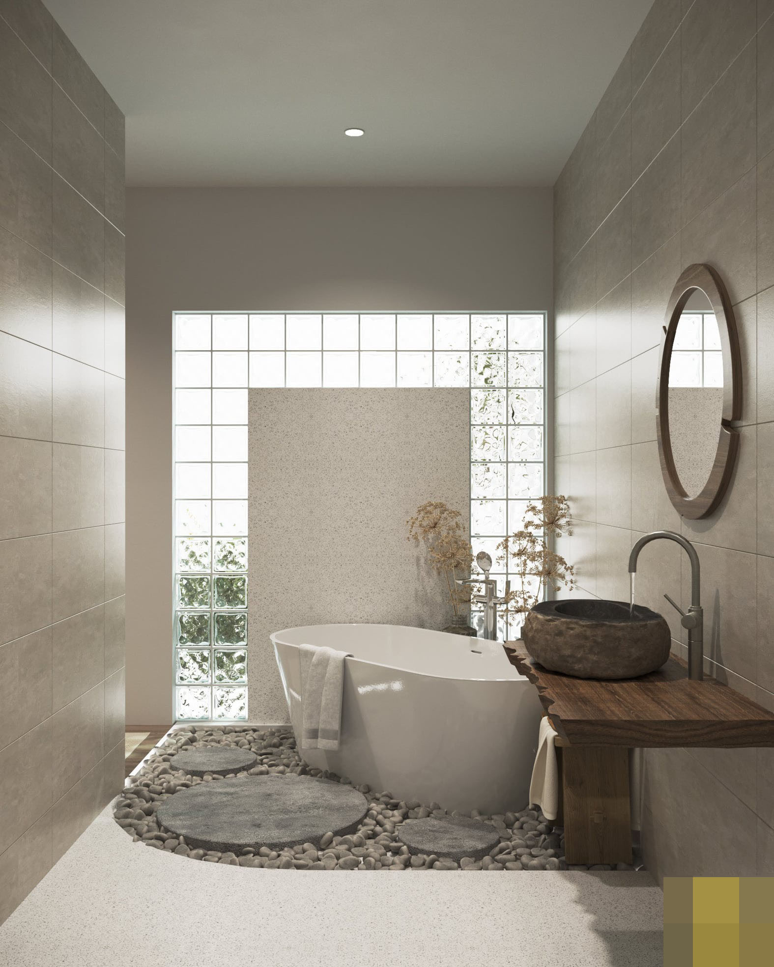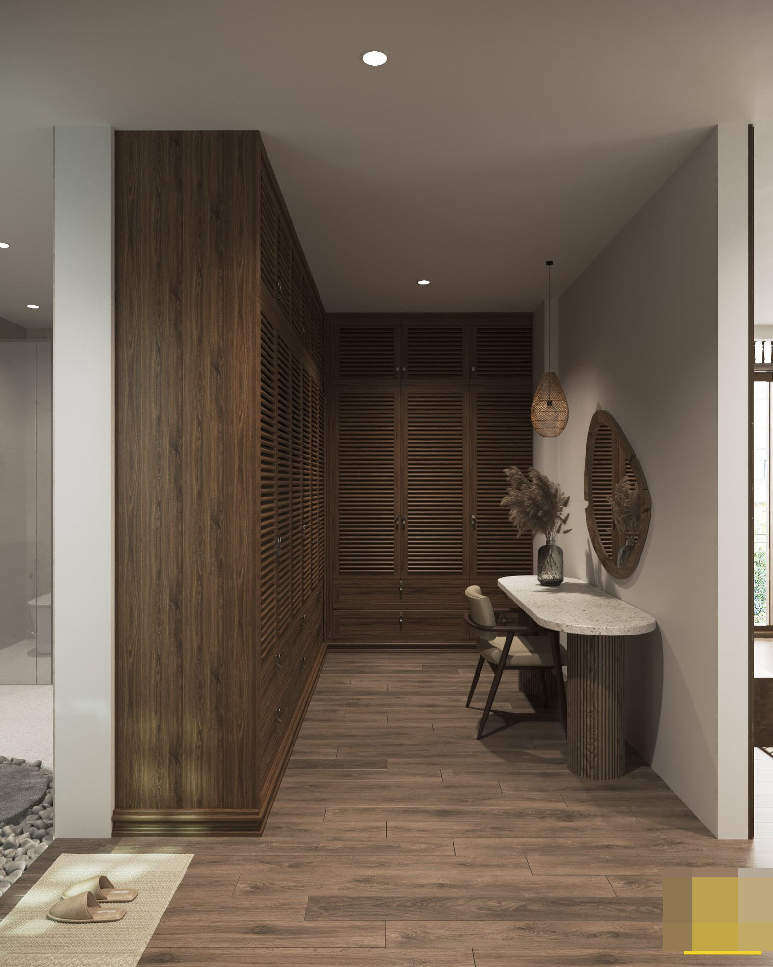 Góc bàn trang điểm, tủ đựng đồ là vùng đệm, ngăn cách phòng ngủ với khu vực phòng tắm, vệ sinh. Hệ tủ chữ L cho gia chủ đựng được nhiều đồ, ngăn nắp và gọn gàng. Phần bồn tắm giáp với khoảng giếng trời nên kiến trúc sư dùng kính mờ làm tường, lấy ánh sáng cho phòng tắm vào ban ngày, hạn chế sử dụng điện năng. Bồn rửa mặt đặt trên miếng gỗ to bản, chân đế là khối bê tông kiên cố, lạ mắt.