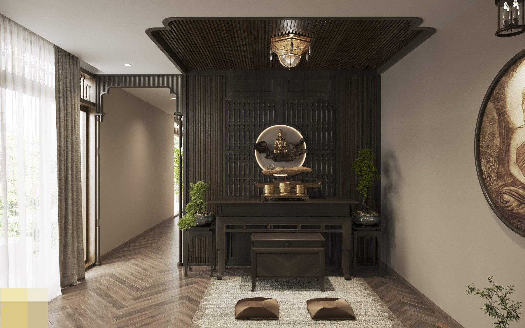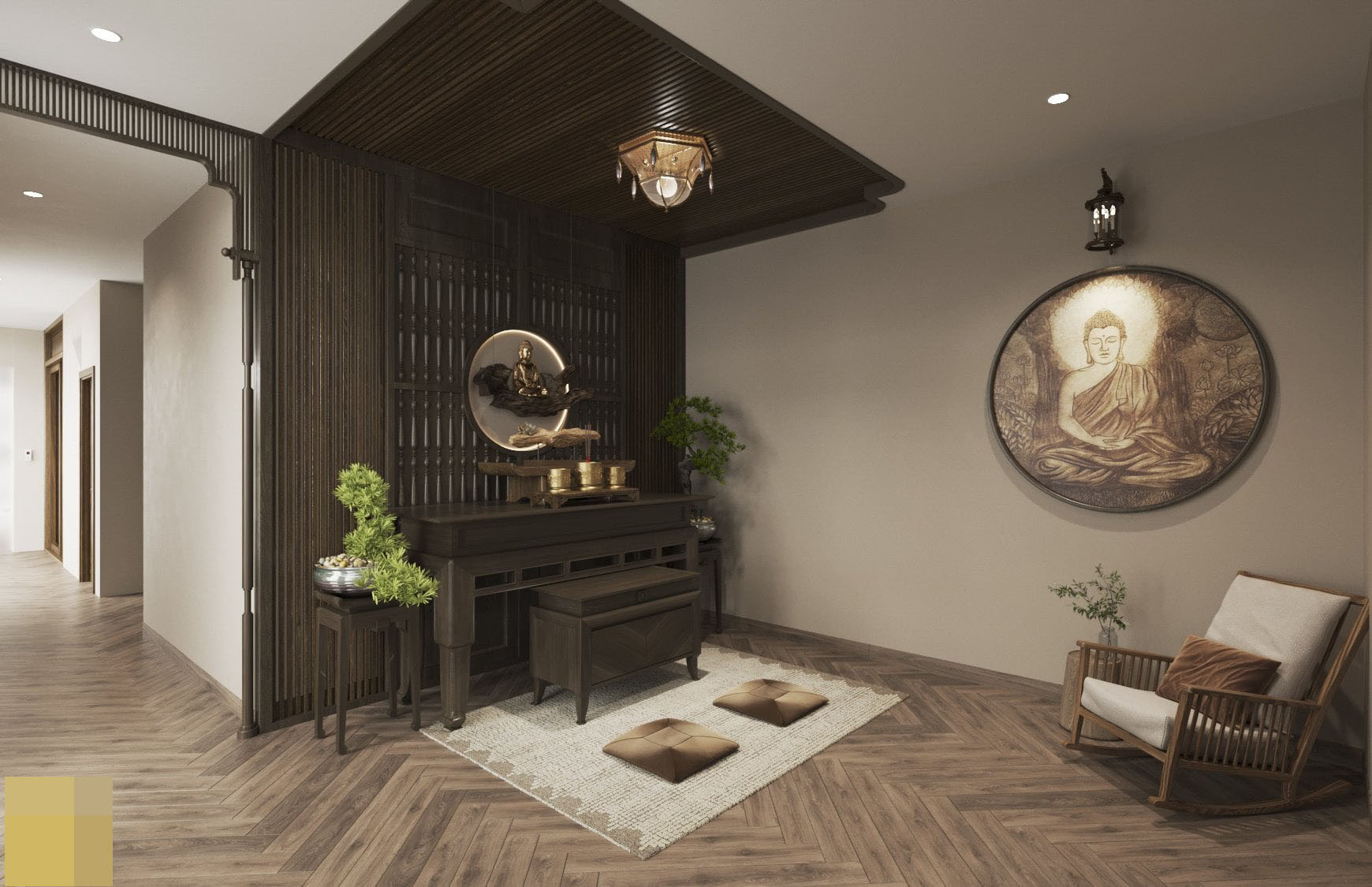 Phòng thờ và nơi thiền tịnh. Một không gian tâm linh trang nghiêm, ấm cúng và yên tĩnh, tách biệt với các phòng chức năng khác.