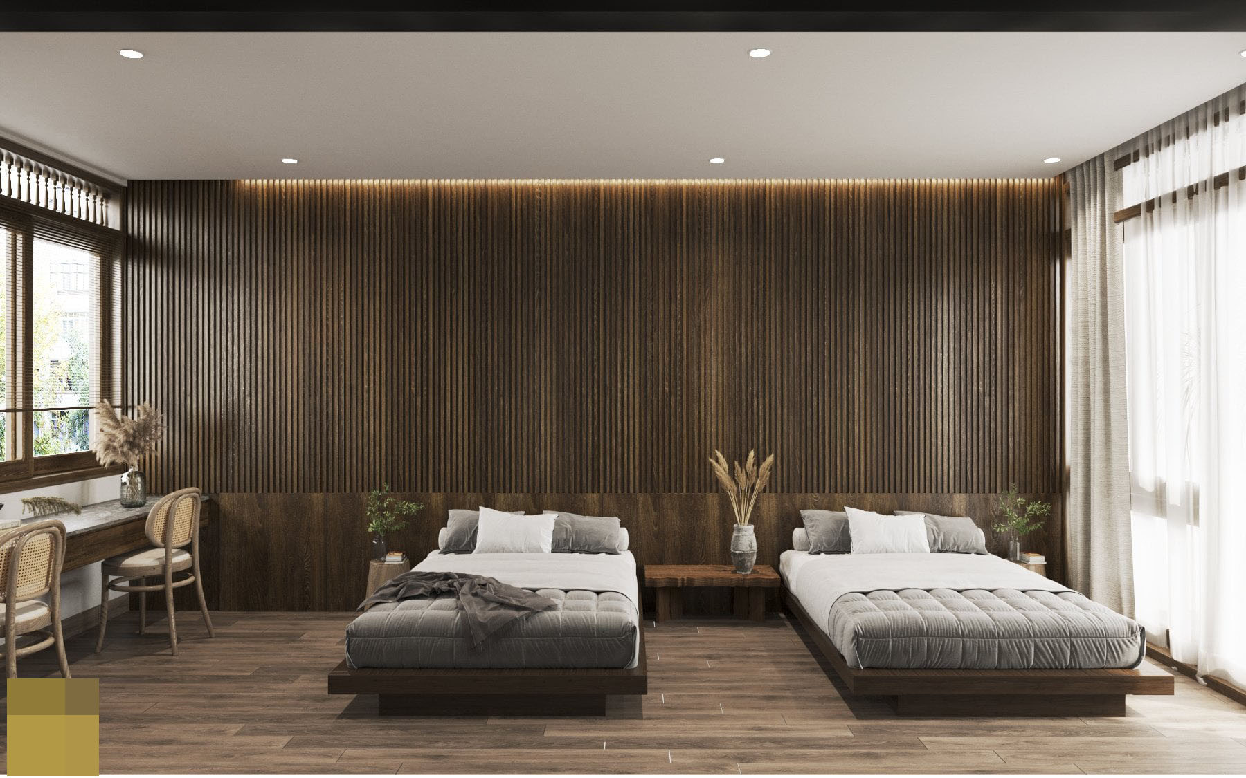Phòng ngủ đôi cho các con, dùng màu nâu trầm nhưng không già nua mà vẫn thể hiện được sự trẻ trung qua đường nét thiết kế.