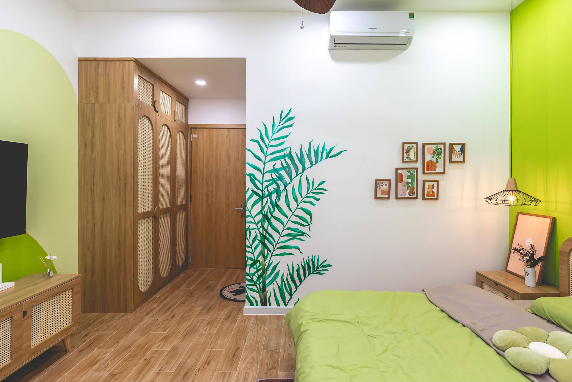 Phòng ngủ master nằm ở tầng 2 với gam màu xanh lá giống với màu sắc tổng thể của ngôi nhà.