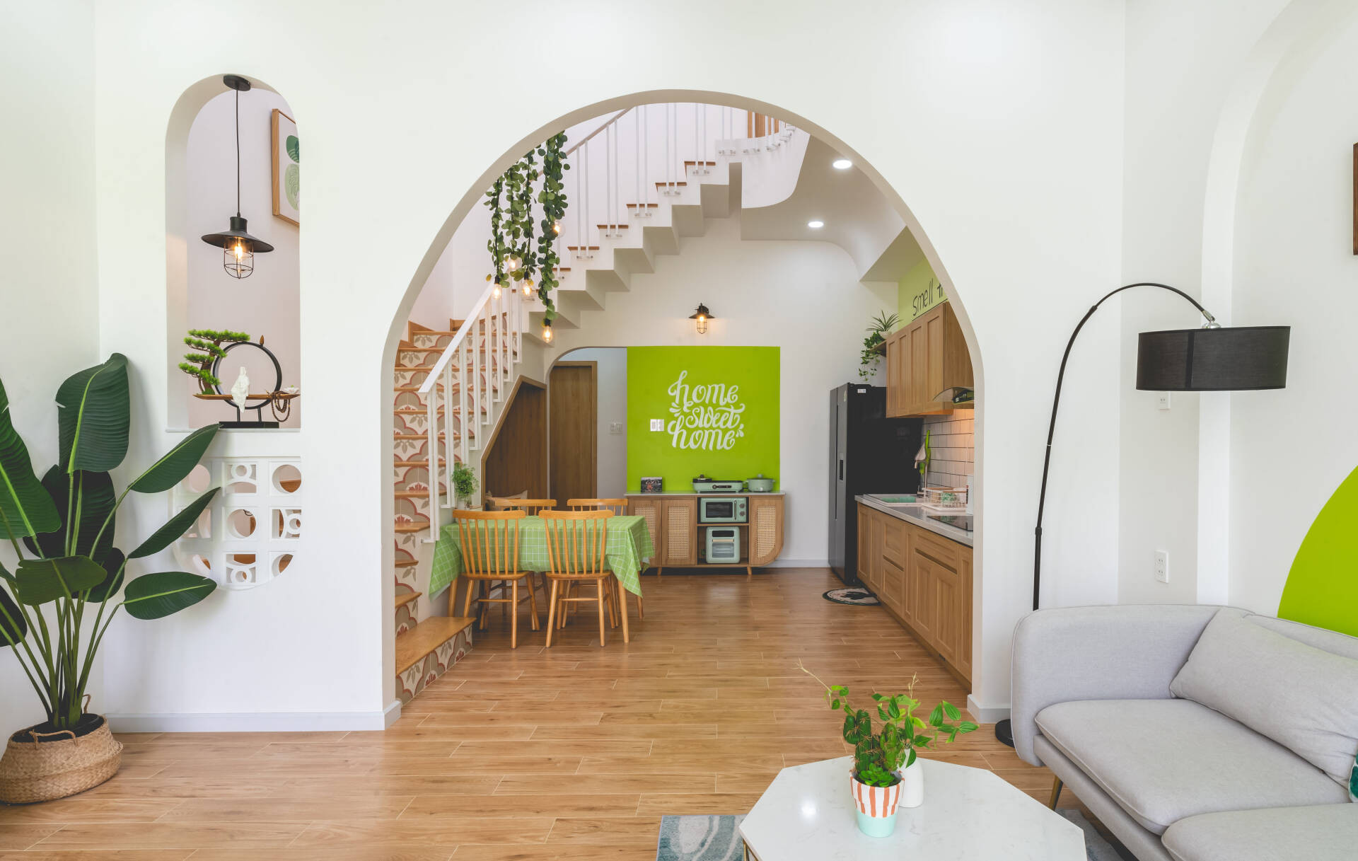 Phòng khách mở rộng với điểm nhấn chính là khu vực tường được sơn xanh tạo vòm cong mềm mại.