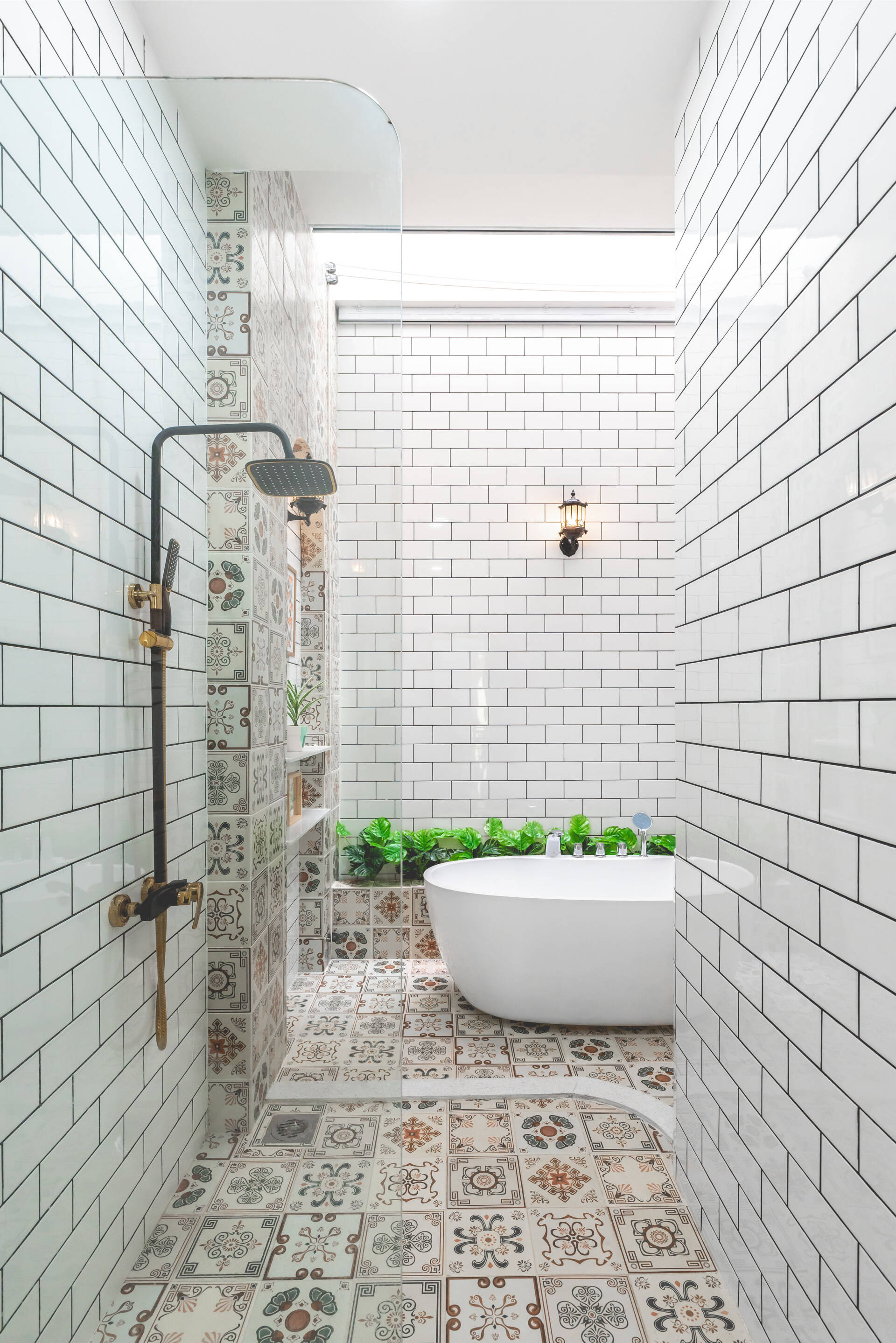 Phòng tắm ở tầng 1 có bồn tắm bên dưới giếng trời, rất sáng và thoáng. Khi nắng quá chói, gia chủ chỉ cần kéo rèm lại.