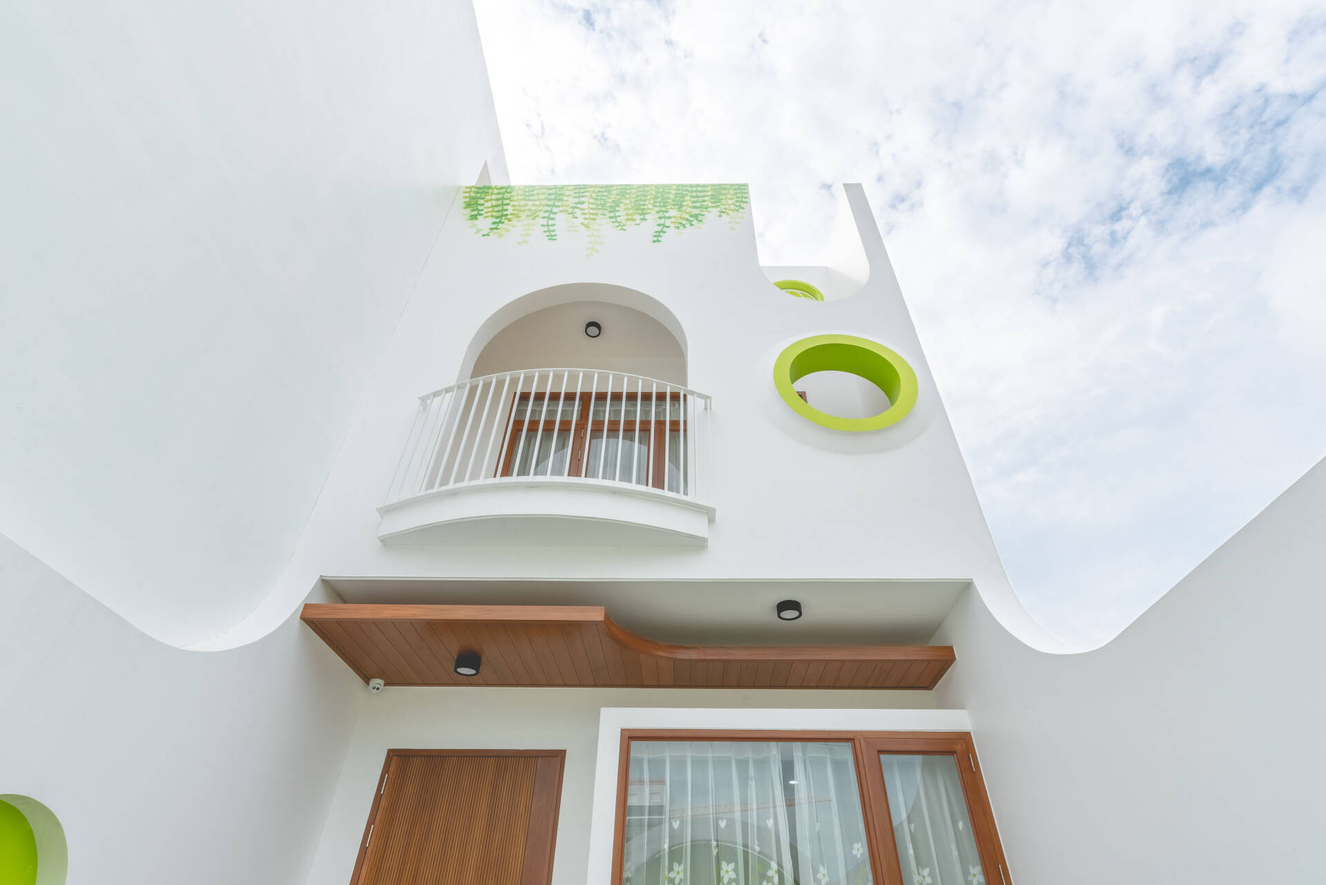 Phần mặt tiền và tổng thể nhà sơn màu trắng sáng kết hợp nâu gỗ. Cửa vòm hình tròn tạo ánh nhìn thú vị cho ngôi nhà.