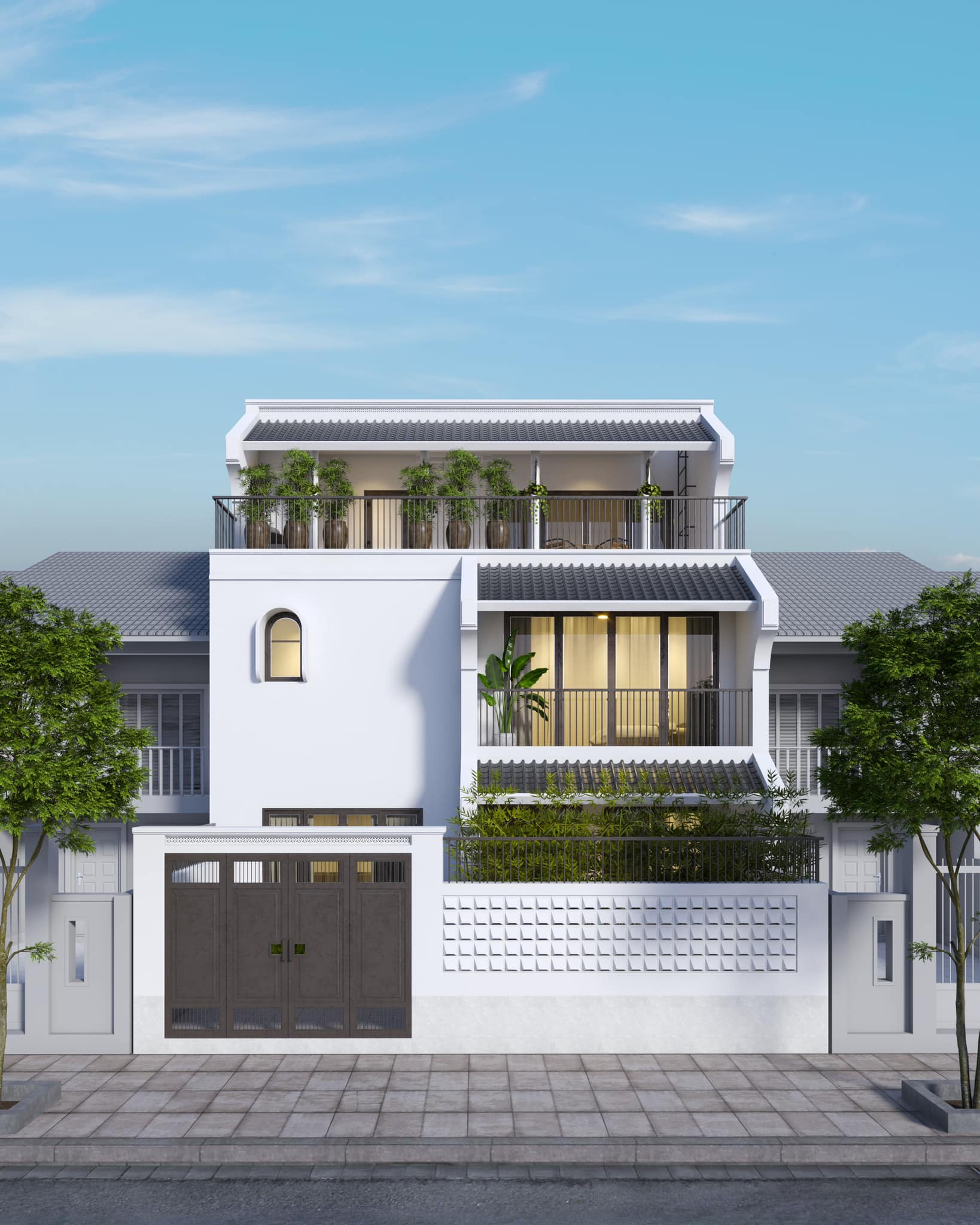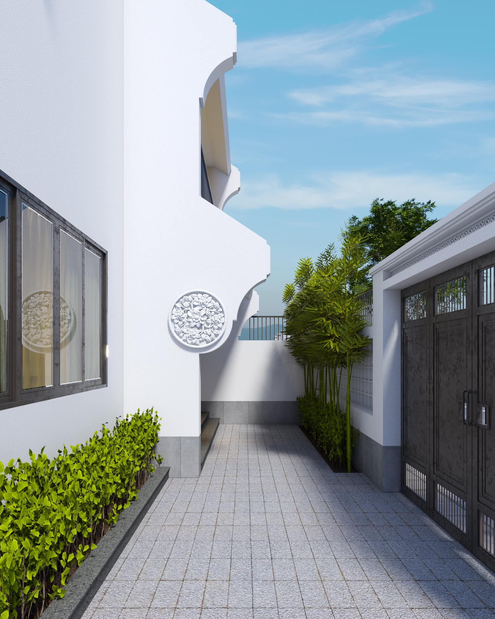 Mặt tiền và ngoại cảnh công trình sơn trắng, điểm màu nâu nhạt ở cánh cổng. Phần mái hiên theo lối dốc, dễ chảy nước mưa. Bờ tường dùng gạch thông gió để đảm bảo sự riêng tư cho gia đình nhưng vẫn đối lưu không khí với bên ngoài.