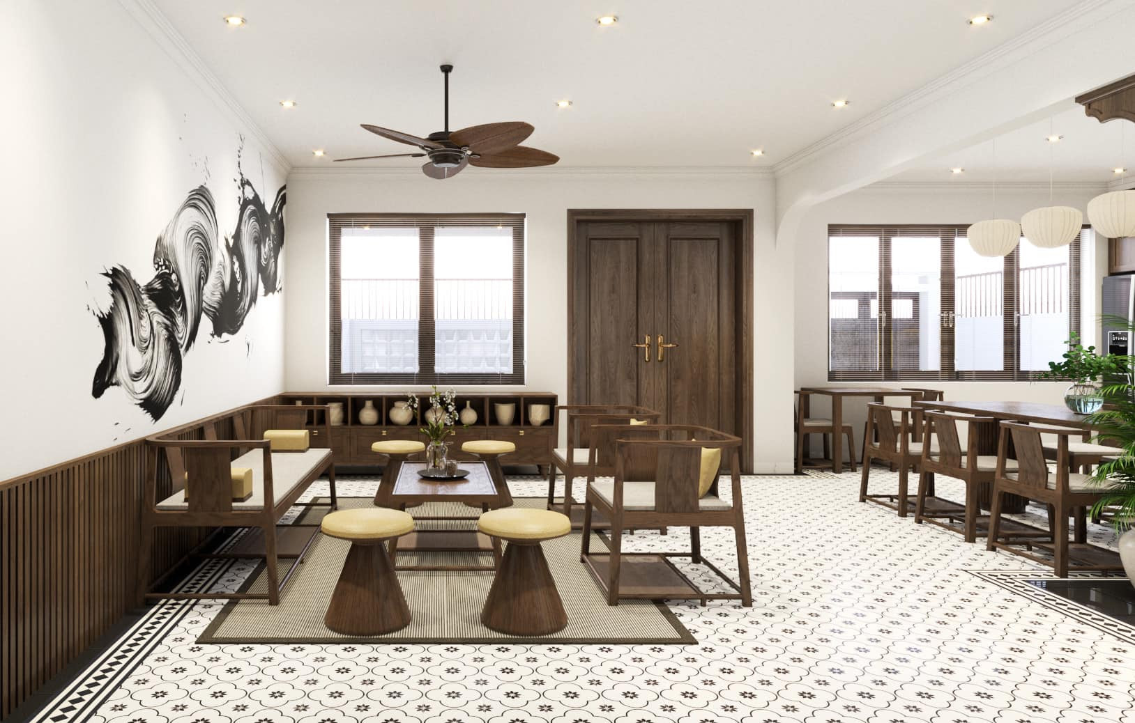 Phòng khách với sofa thiết kế hoài cổ, chi tiết không cầu kỳ. Sàn nhà lát gạch bông mát mẻ, chống trượt. Trần ốp thạch cao hiện đại nhưng đan xen với cổ điển thông qua chiếc quạt trần gỗ màu nâu. Tường nhà ốp gạch đồng màu với nội thất. Lớp gỗ ốp tường vừa có tác dụng thẩm mỹ, vừa tạo điểm nhấn.