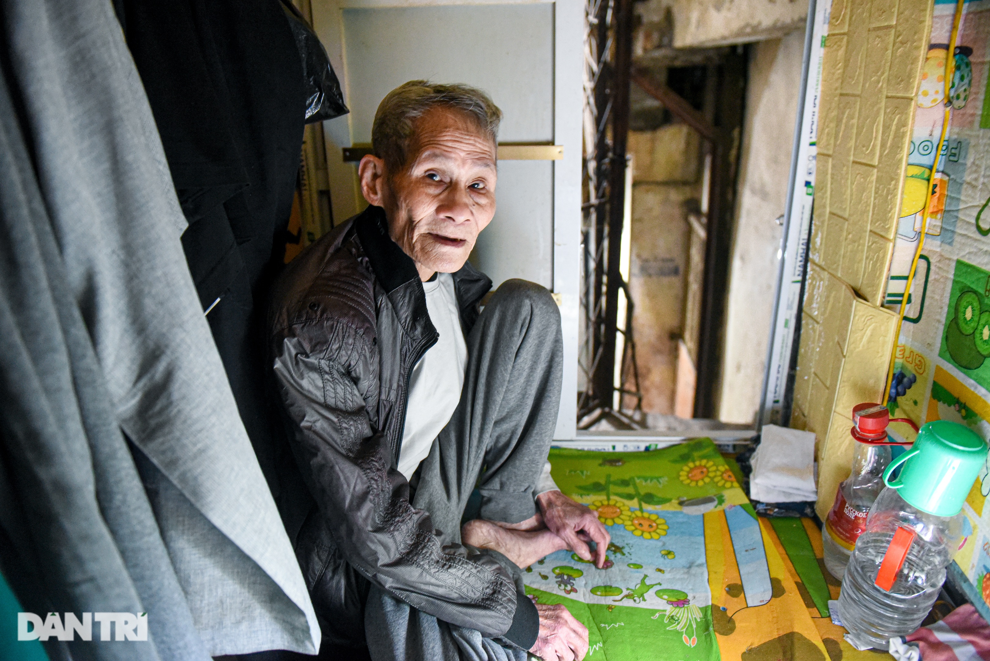Không gian sống của hai bố con ông Cao "lơ lửng" ở một góc cầu thang với cánh cửa lúc đóng vừa bằng nửa tấm chiếu. Mỗi lần cửa mở, chiều ngang chỉ rộng hơn 2 gang tay người trưởng thành. Lúc ra hay vào, cụ ông cao 1 m63, nặng 44 kg đều phải luồn cúi, khom lưng mới lọt qua.