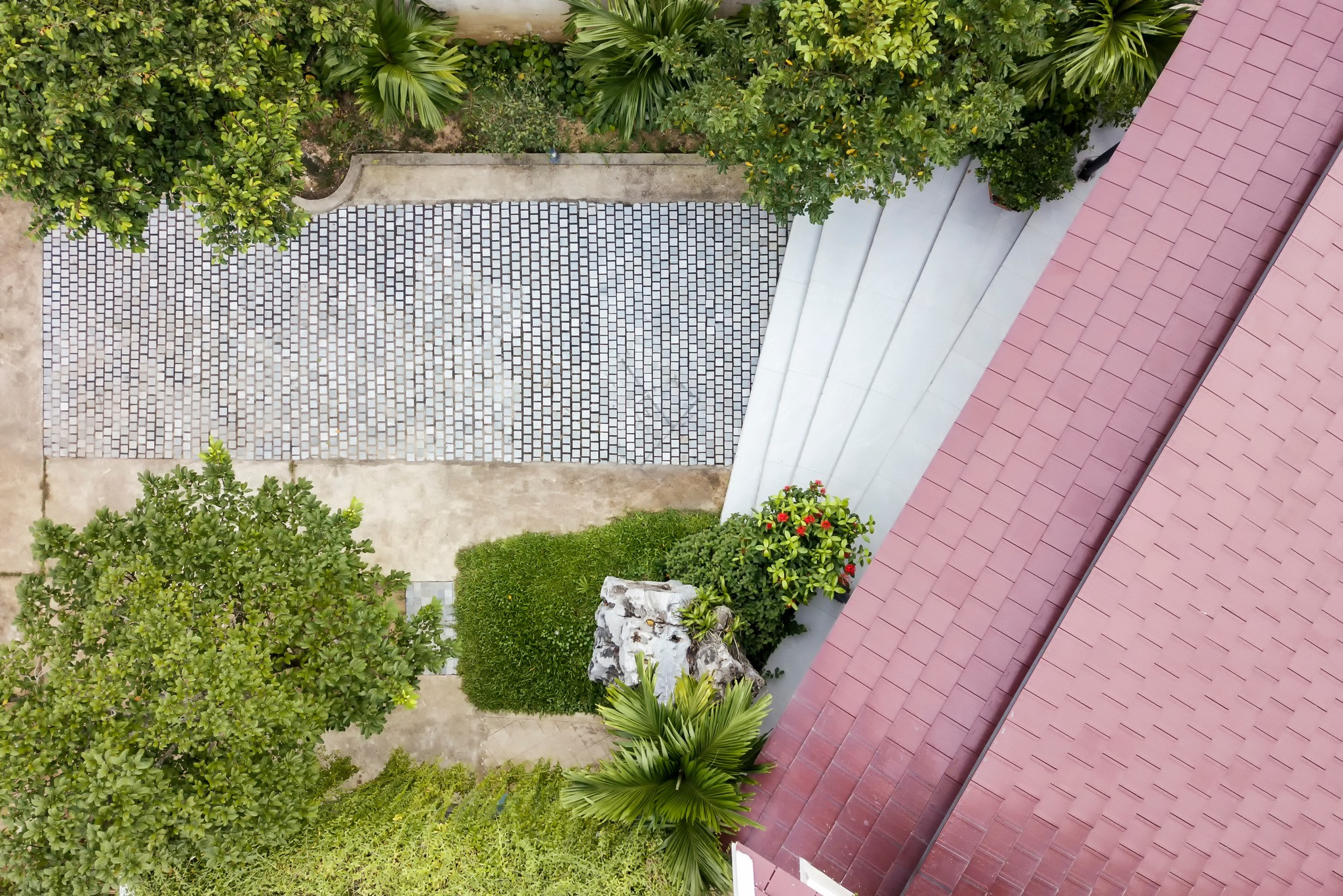 Ngôn ngữ thiết kế hiện đại nhưng cũng mang chút hơi thở kiến trúc truyền thống, được thể hiện qua hệ mái xéo và hệ cửa bức bàn - loại cửa truyền thống đặc trưng tại vùng Đồng bằng Bắc Bộ của nước ta.
