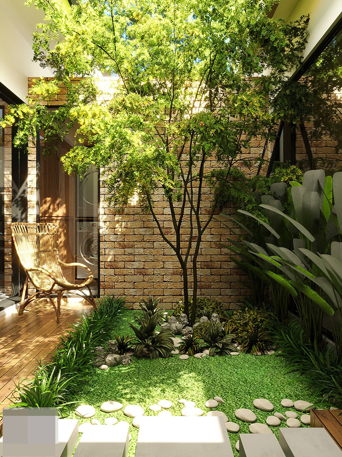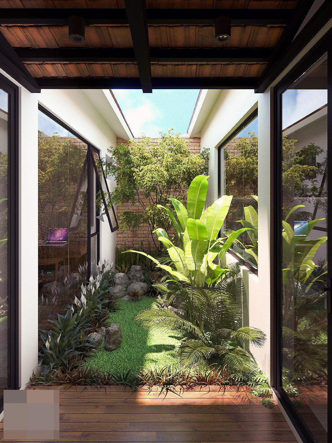 Màu xanh mát của cây xanh khi hoà mình vào thiên nhiên tại khu vườn nhỏ giữa nhà, nhiều khoảng không mở tận dụng ánh sáng tự nhiên.