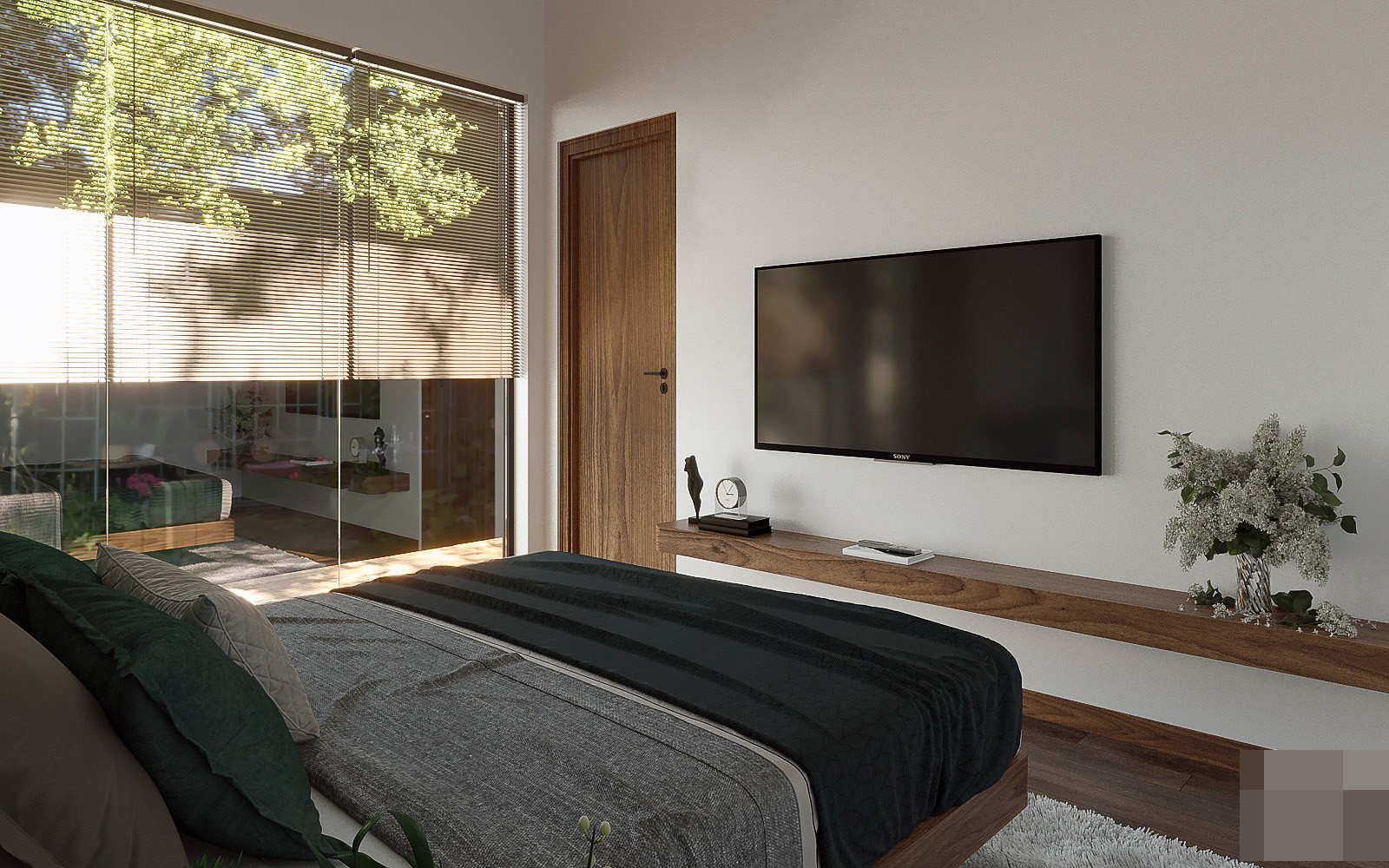 Ai rồi cũng sẽ yêu phòng ngủ view thiên nhiên thế này. Nội thất đơn giản, gọn gàng, nổi bật với khung cửa kính lớn thay tường gạch, đón trọn mảng xanh mát mắt. Các kiến trúc sư phối hợp sơn trắng và sơn hiệu ứng giả bê-tông để làm phòng có dấu ấn hơn.