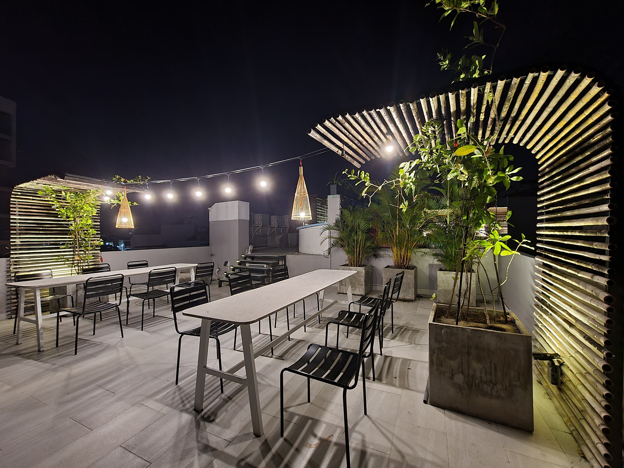 Sân thượng, lối dẫn lên khu bể bơi mang chút hơi hướng của biển với ô bằng lá cọ, làm cói với cây sắc màu rực rỡ như nắng.