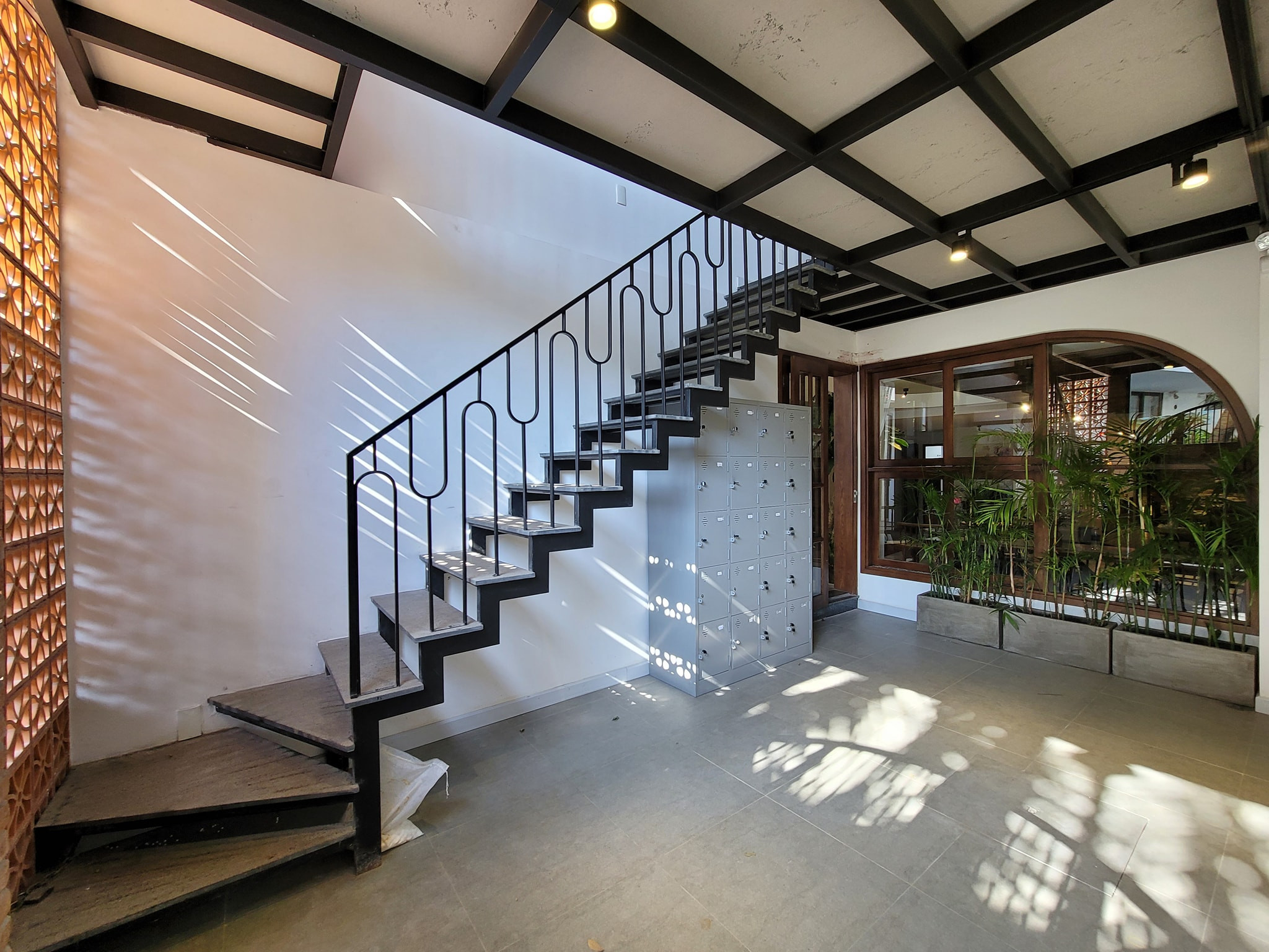 Do xung quanh là nhà dân nên chị Dung đưa các ban công từ phòng ngủ ra đón ánh sáng dưới giếng trời. Giải pháp này giúp không gian nhà thật thoáng mát. Nếu nhìn từ dưới tầng 1 lên, ta cảm nhận nhà như một mê cung xoắc ốc.