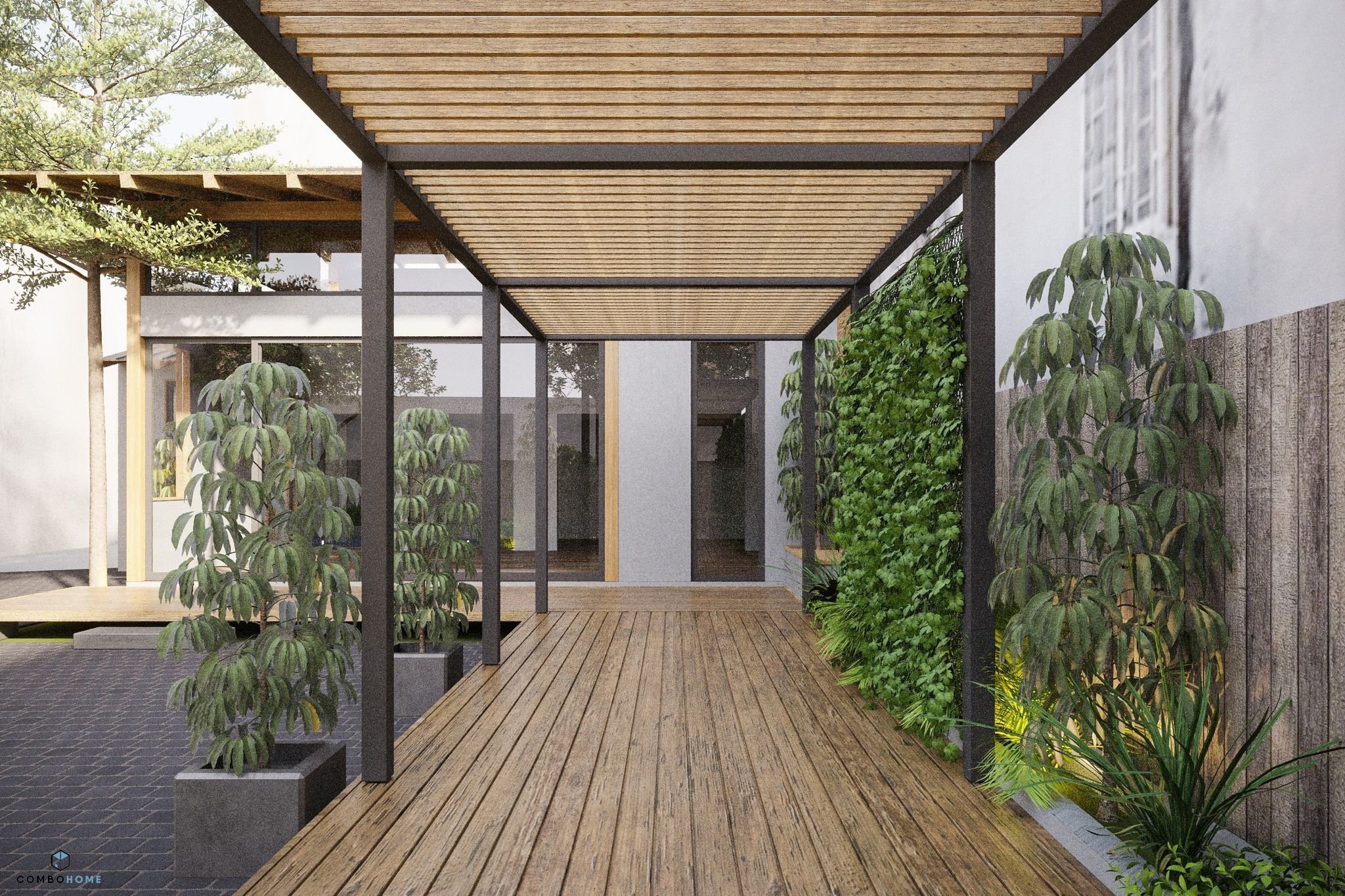 Bậc thềm ngồi ngoài trời có xương bằng kẽm và bề mặt nhựa giả gỗ bền vững với thiên nhiên. Cây bụi được trồng xung quanh và cây dây leo bám lên xà trong tương lai. Tổng diện tích đất là 200m2, diện tích xây dựng 80m2, diện tích sử dụng 140m2. Chi phí đầu tư khoảng 2 tỷ đồng.