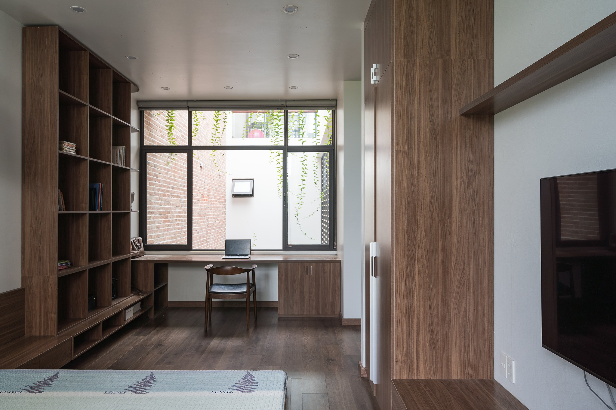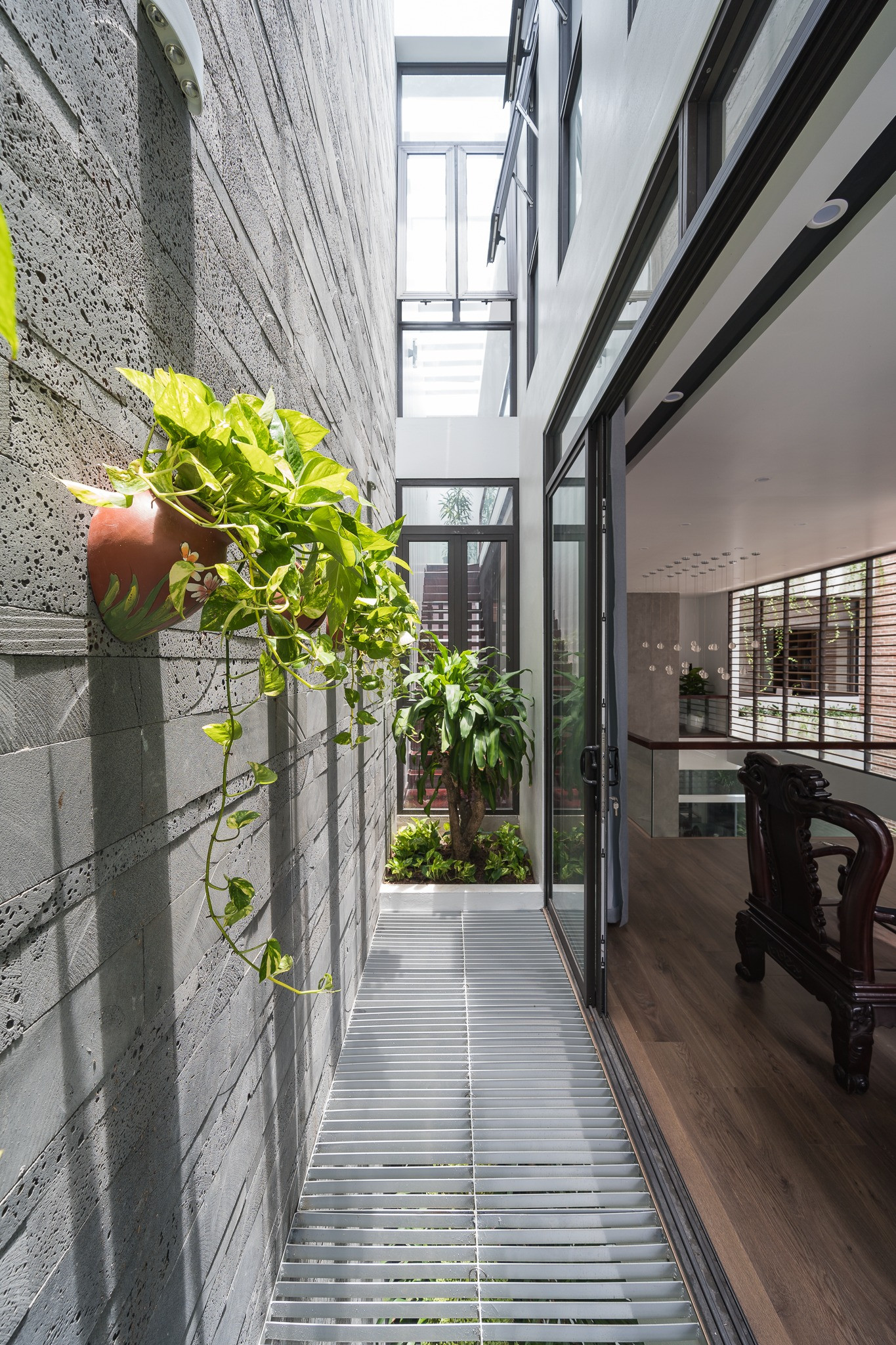 Ngoài giếng trời trung tâm, kiến trúc sư tạo ra giếng trời nhỏ chạy dọc nhà, để tạo ra luồng đối lưu gió. Anh Quang Vinh chia sẻ thêm, ở các giếng trời, nhóm thường trồng cây thần tài núi, cây xanh kết hợp mảng đá nhám hoặc gạch để giảm tiếng ồn khi hút gió xuống.