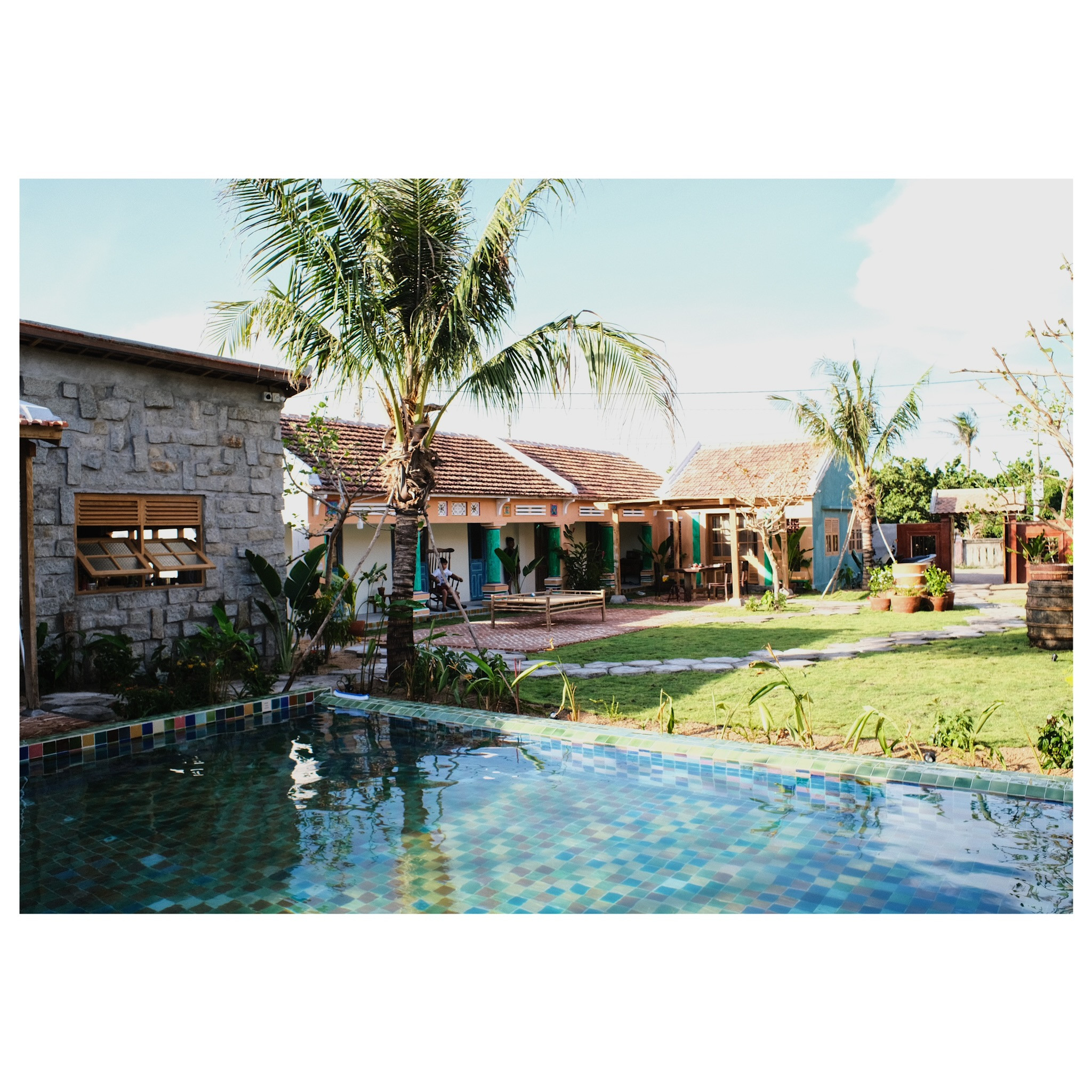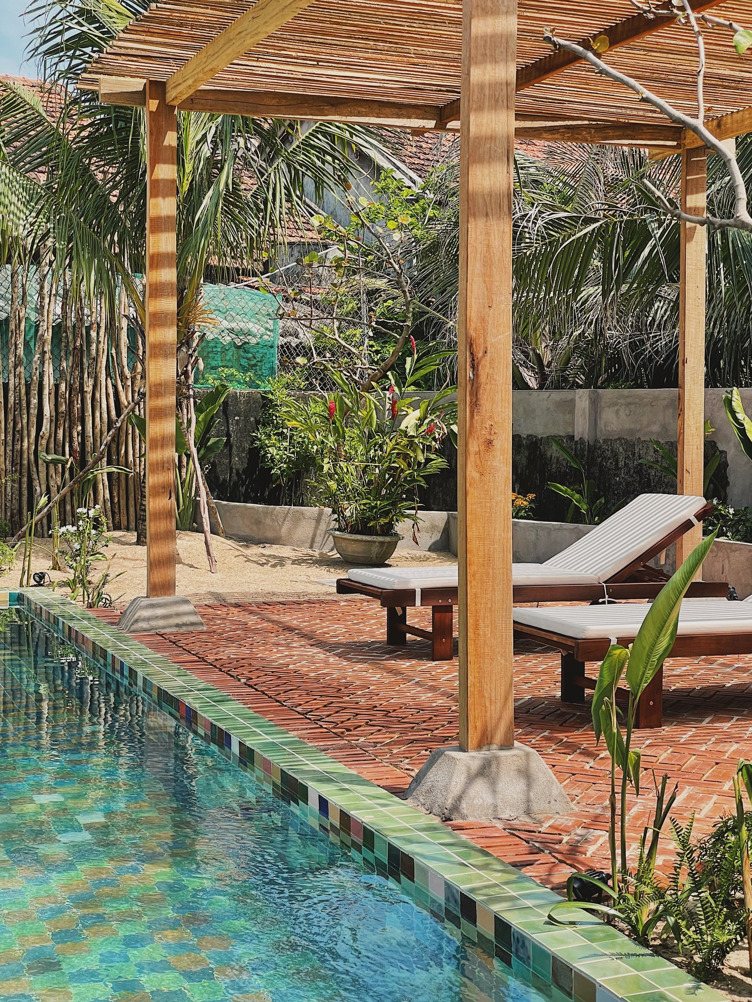 Bể bơi dùng nước máy, không sử dụng hóa chất và được định kỳ thay nước, rửa bể thường xuyên nên rất sạch. Gạch lát bể độc đáo, nhiều màu sắc.