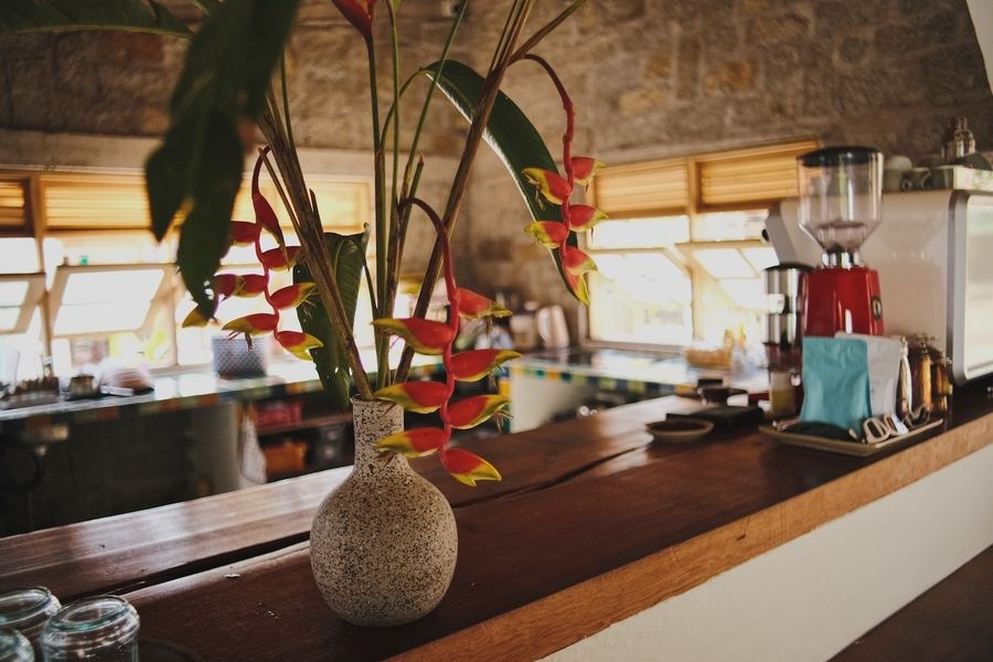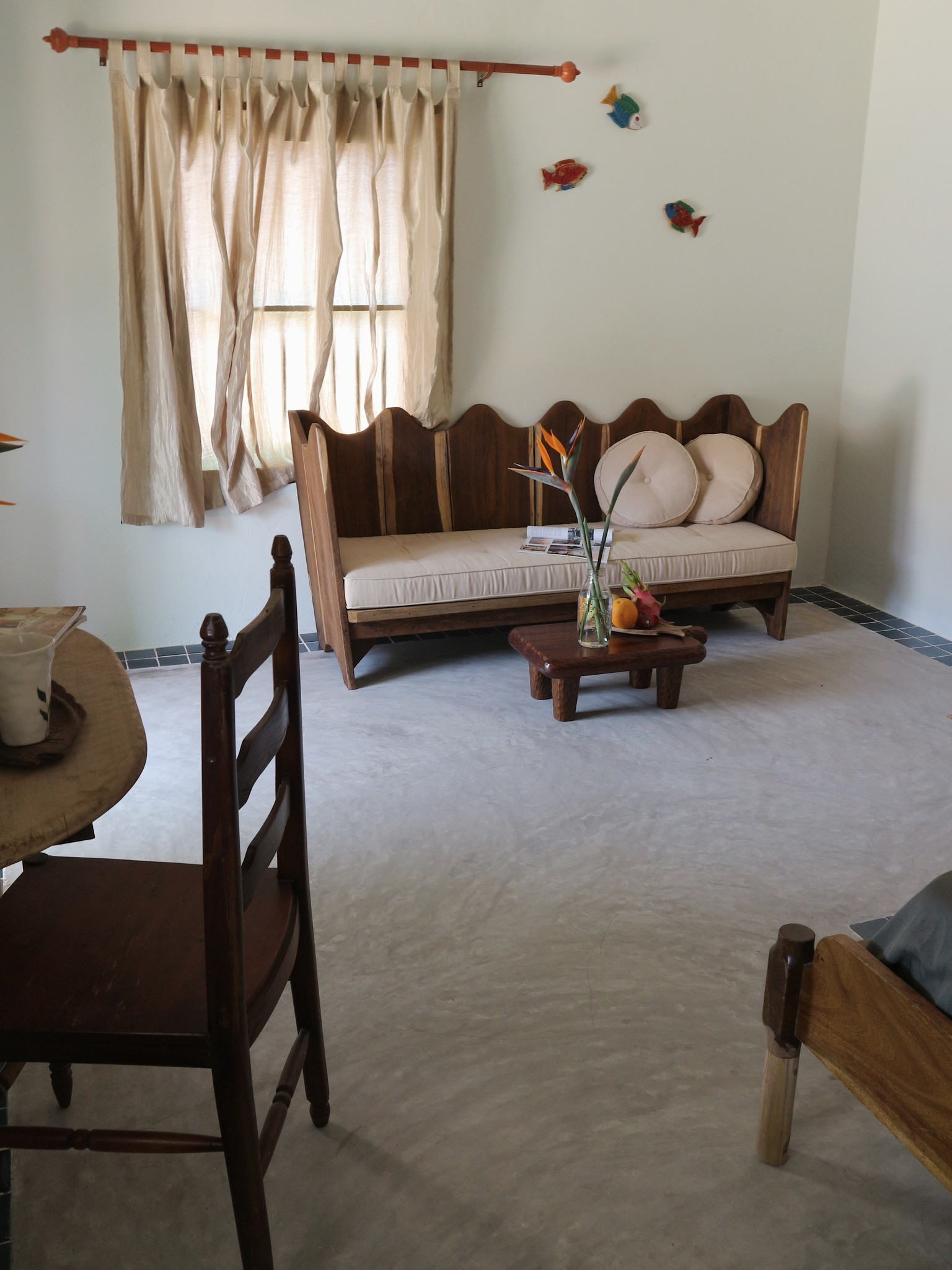 Nền nhà dùng bê-tông mài, viền xung quanh bằng gạch bông nhỏ làm điểm nhấn. Nội thất bằng gỗ do anh Tùng tự lên ý tưởng, thiết kế để phù hợp với bối cảnh không gian.