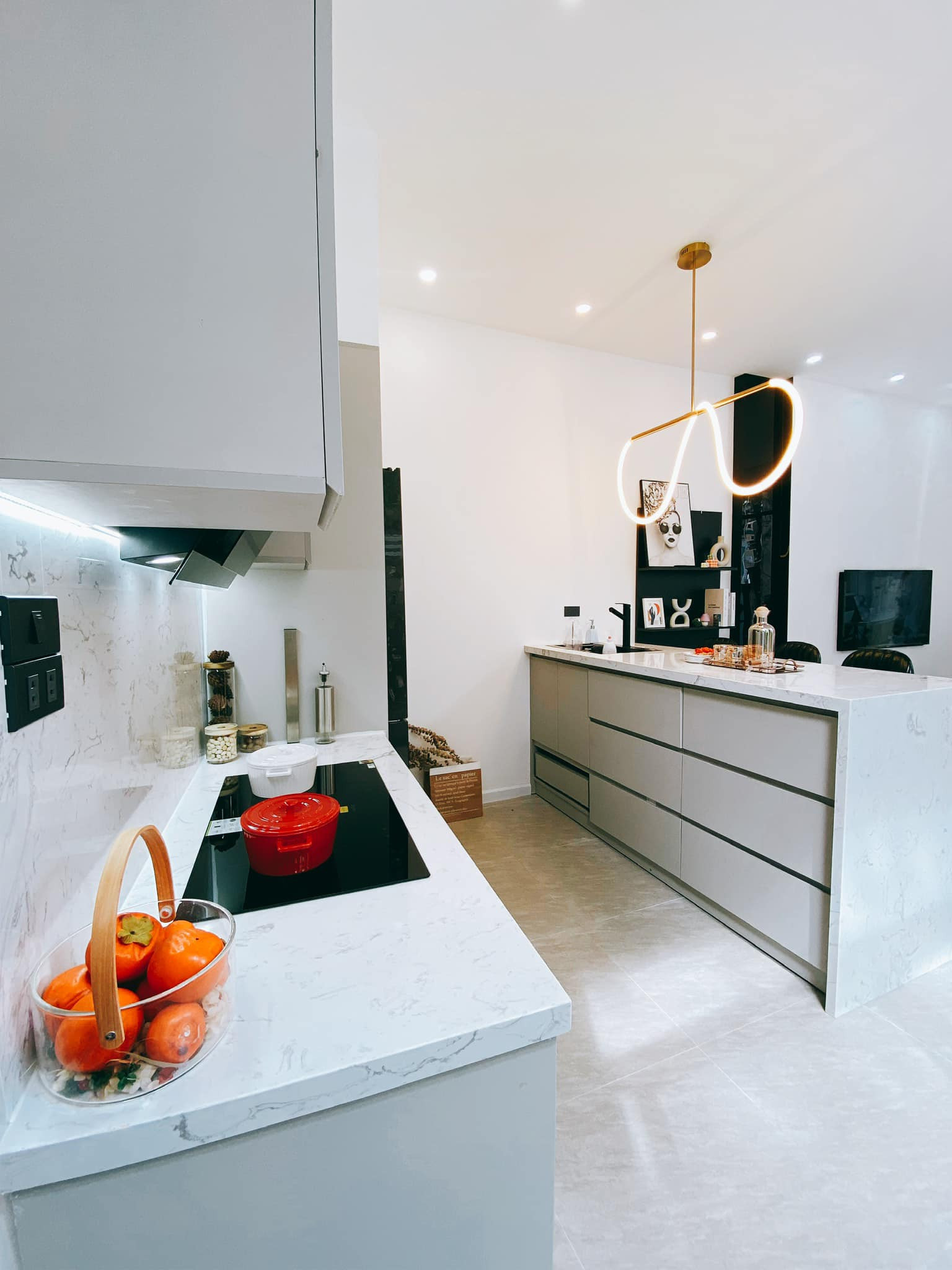 Bàn đảo dùng đá nhân tạo vân trắng dễ lau chùi, vệ sinh. Tuy nhiên, để giữ mặt bếp luôn trắng sáng theo thời gian, nữ gia chủ giữ khá cẩn thận, tránh để đồ ố màu dây ra mặt bàn.