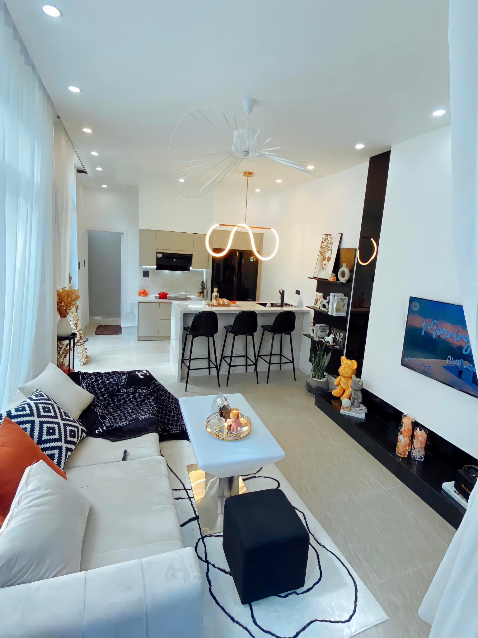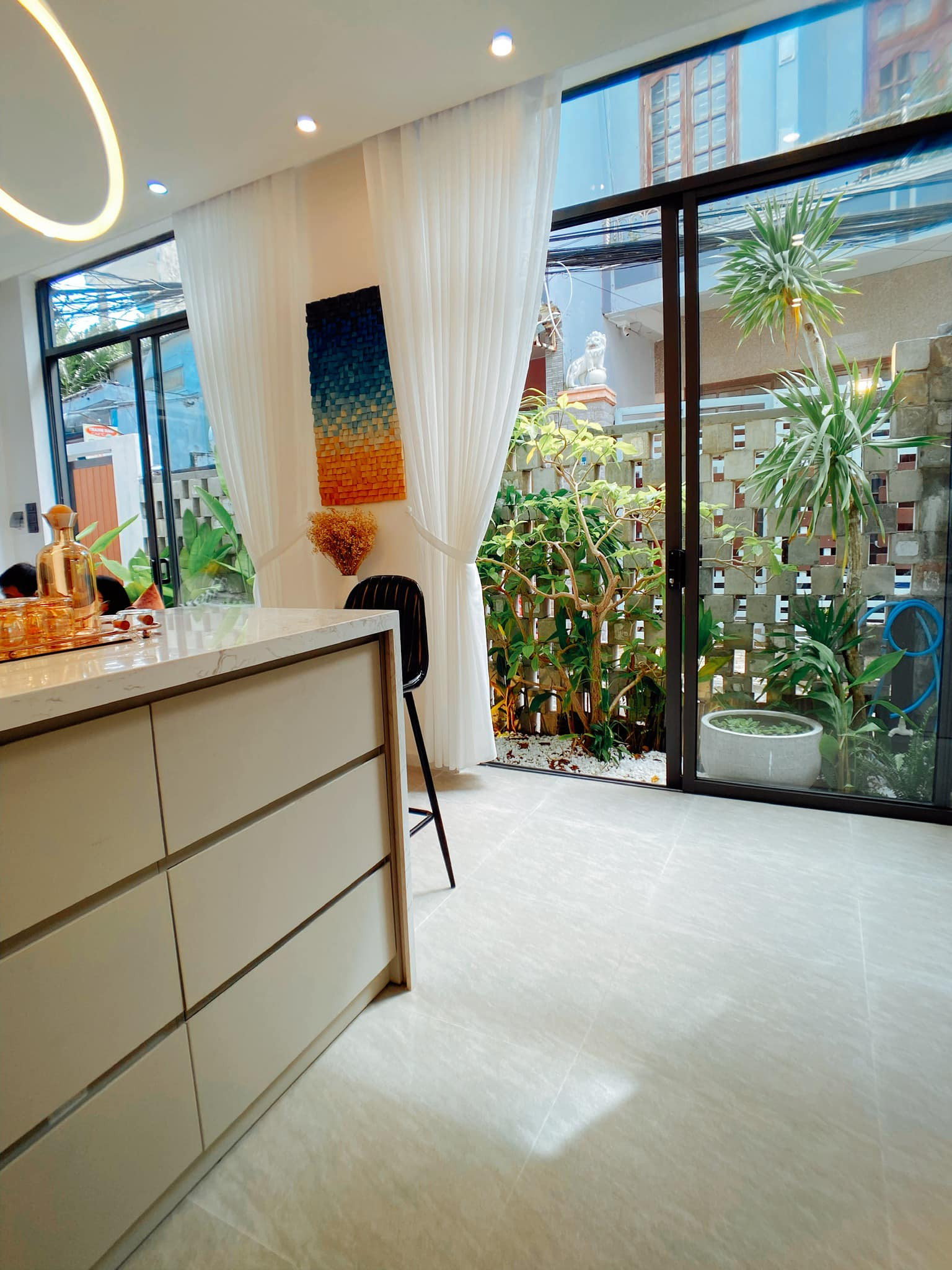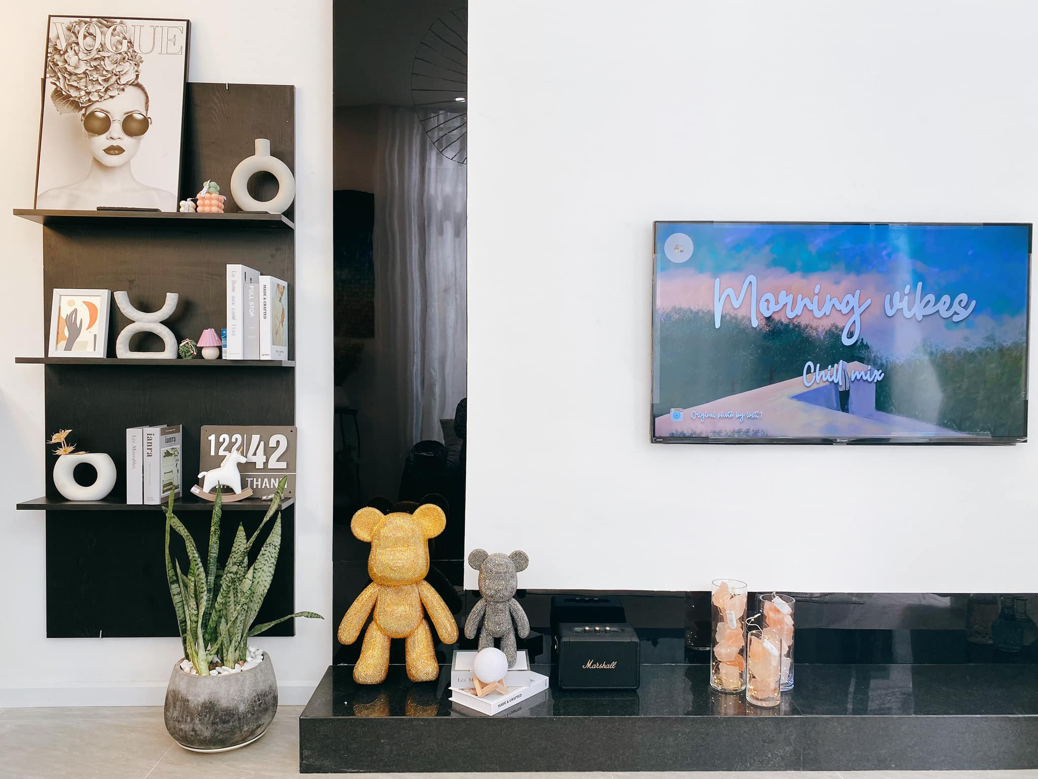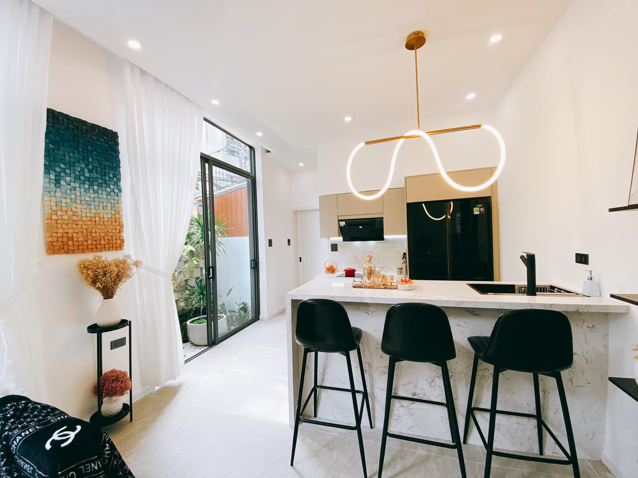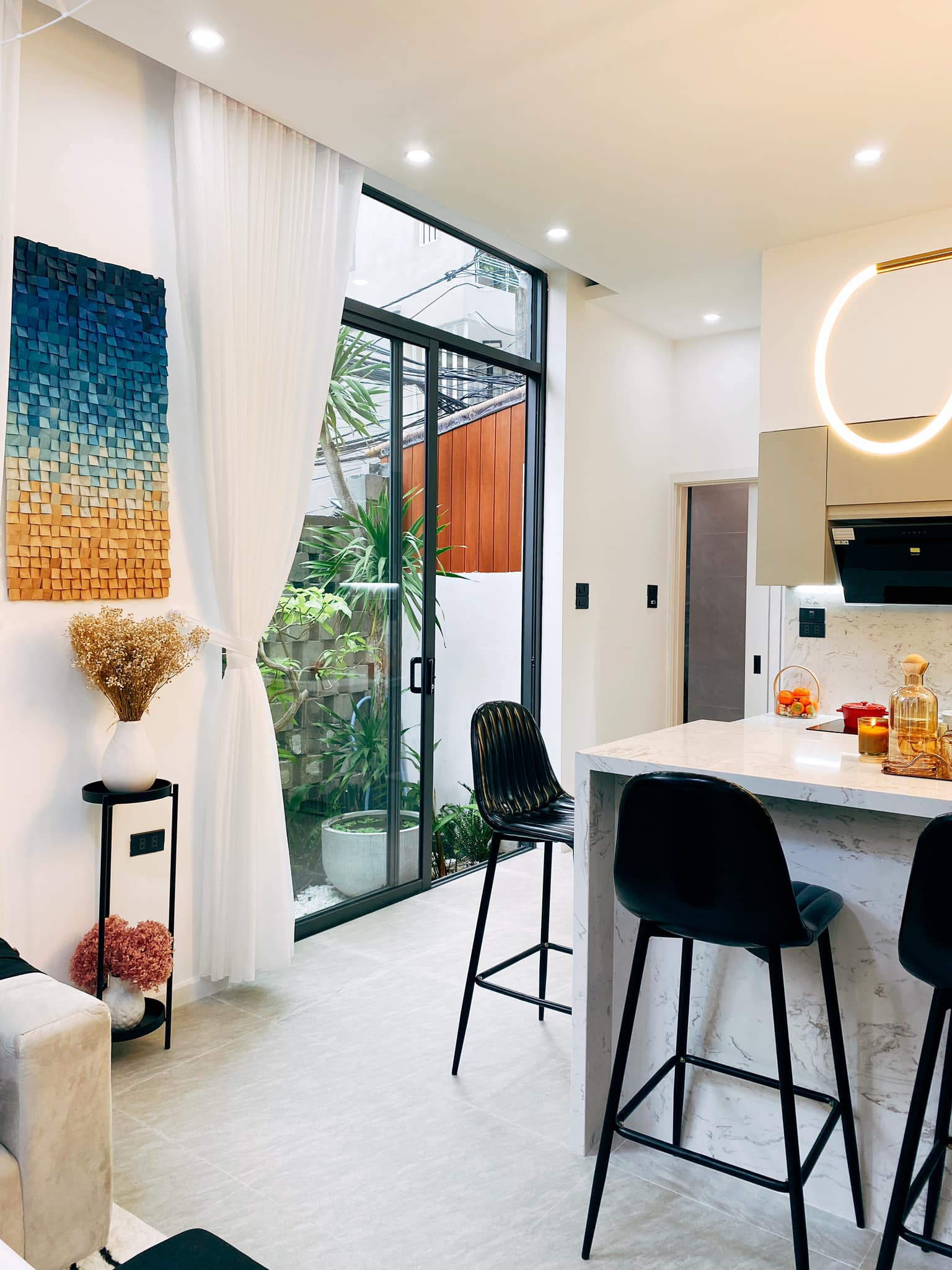 Nội thất đơn giản, nhẹ nhàng và không dùng hệ tủ kệ cồng kềnh. Đồ decor ấn tượng, đủ để thu hút mọi người.