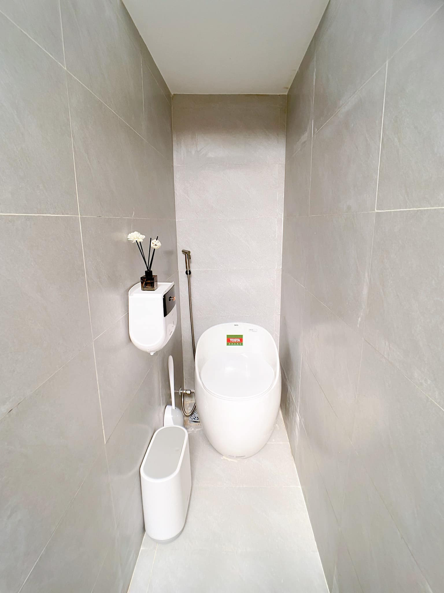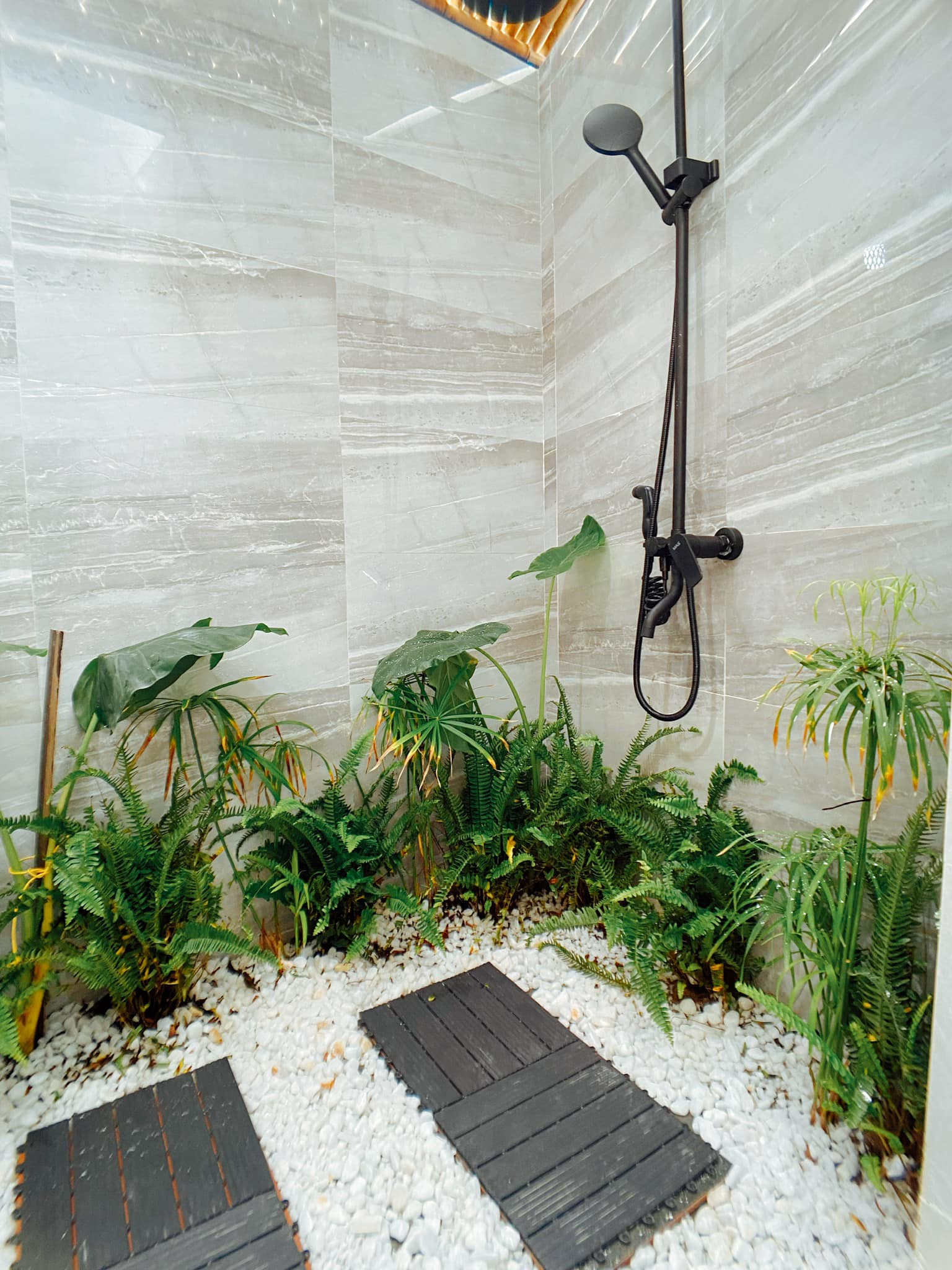 Phòng vệ sinh chính (trong phòng ngủ master) và phụ. Phòng chính rộng hơn nên có không gian để bố trí cây cảnh, sỏi trắng và vòi sen cây bắt mắt. Phòng vệ sinh nhỏ có chiều ngang hẹp nên chỉ đặt được bồn cầu.