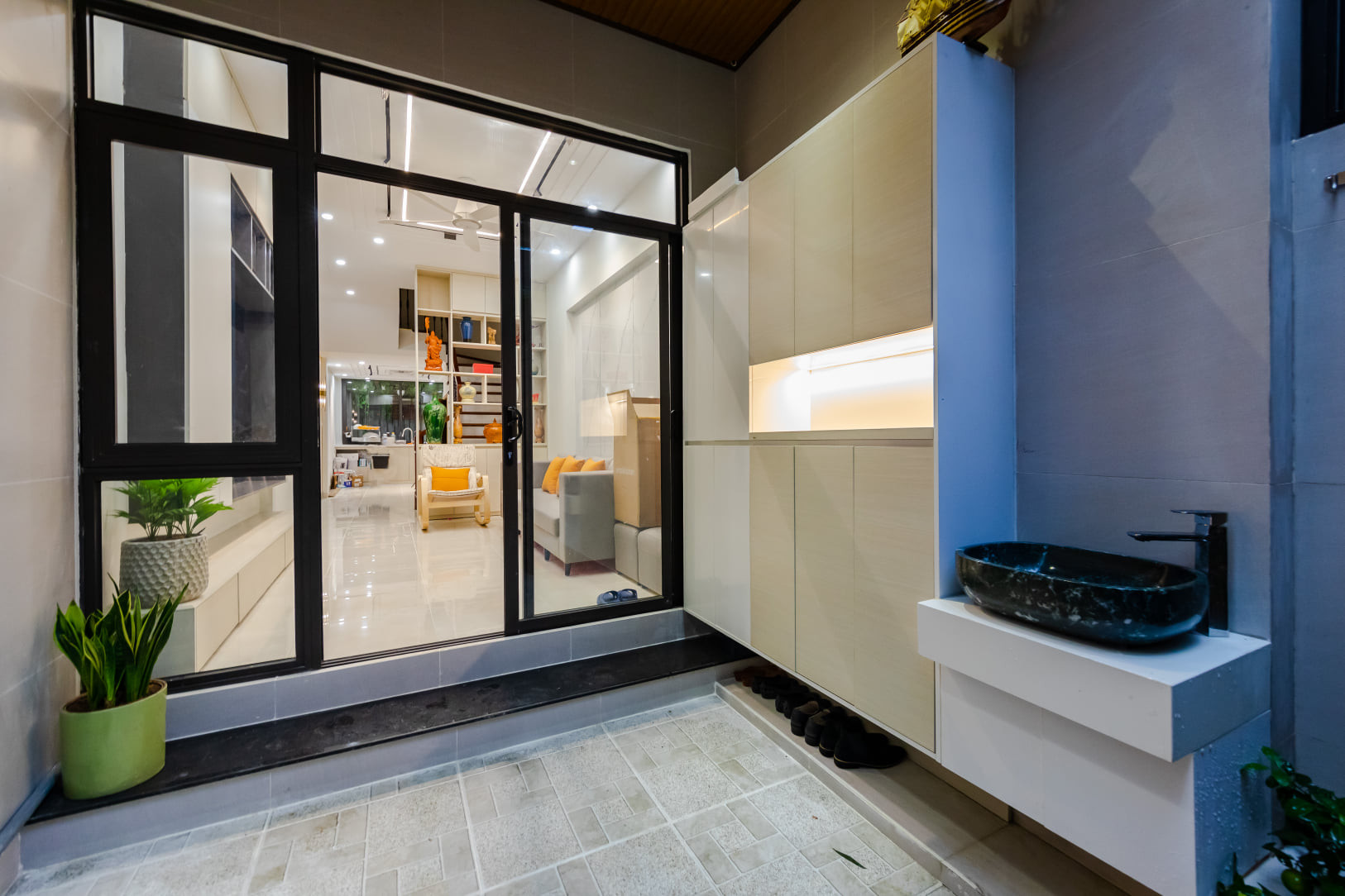 Khu vực sân bố trí tủ giày cỡ lớn, cất mũ bảo hiểm và các loại giày dép của đại gia đình. Kế bên là bồn rửa tay, phục vụ mọi người đi về, có thể vệ sinh trước khi vào nhà.