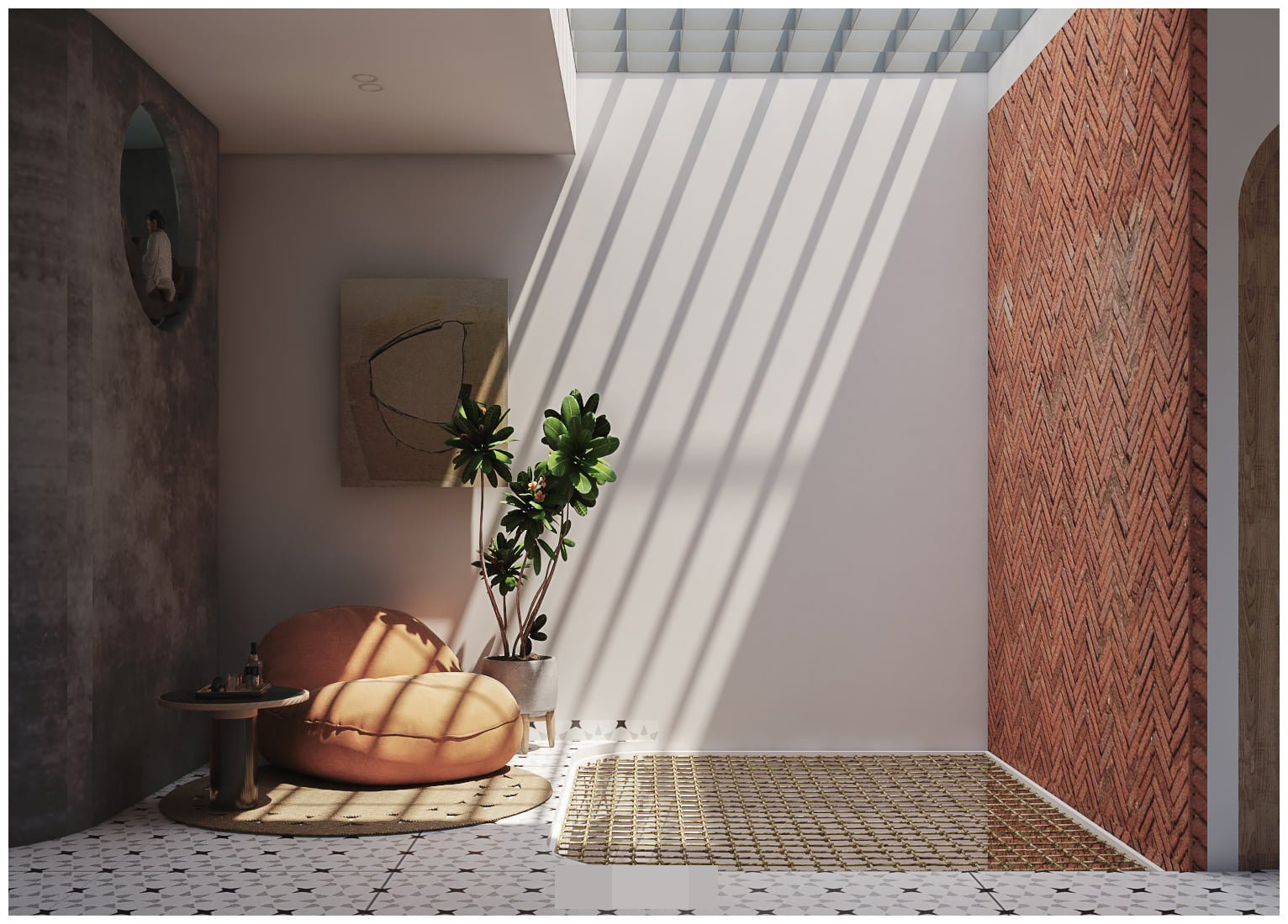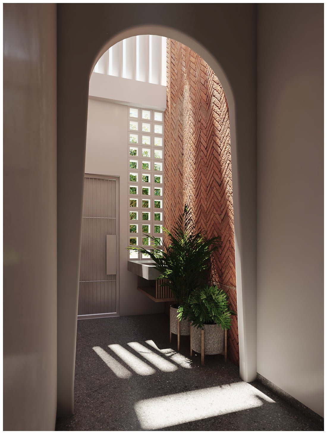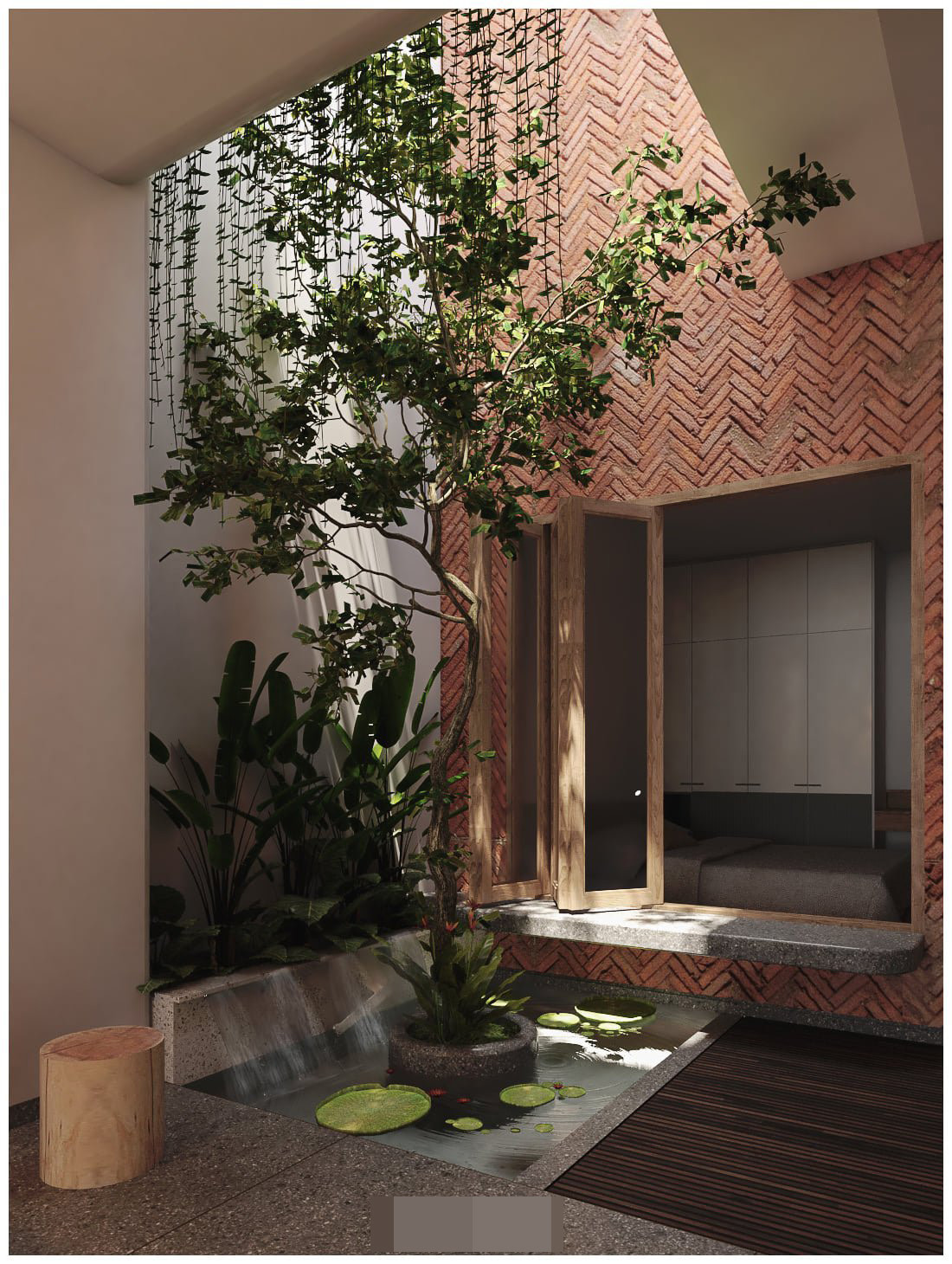 Hai khoảng giếng trời đẹp mắt với mảng tường ốp gạch đỏ theo hình xương cá thẩm mỹ. Bóng nắng hắt từ gạch thông gió tạo nên sự huyền ảo khó cưỡng. Phía dưới còn có hồ nước trồng hoa súng, giúp điều hòa nhiệt độ cho phòng.