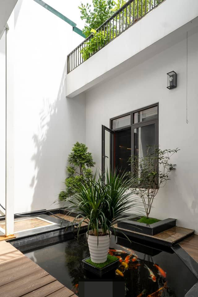 Khoảng nghỉ tiếp nối với phòng bếp là bể cá Koi sinh động. Bể cá có tác dụng điều hòa không khí, giảm nhiệt cho nhà khi trời nắng. Phía trên mái của bếp là vườn trồng rau sạch và khu nướng BBQ sát bìa rừng.
