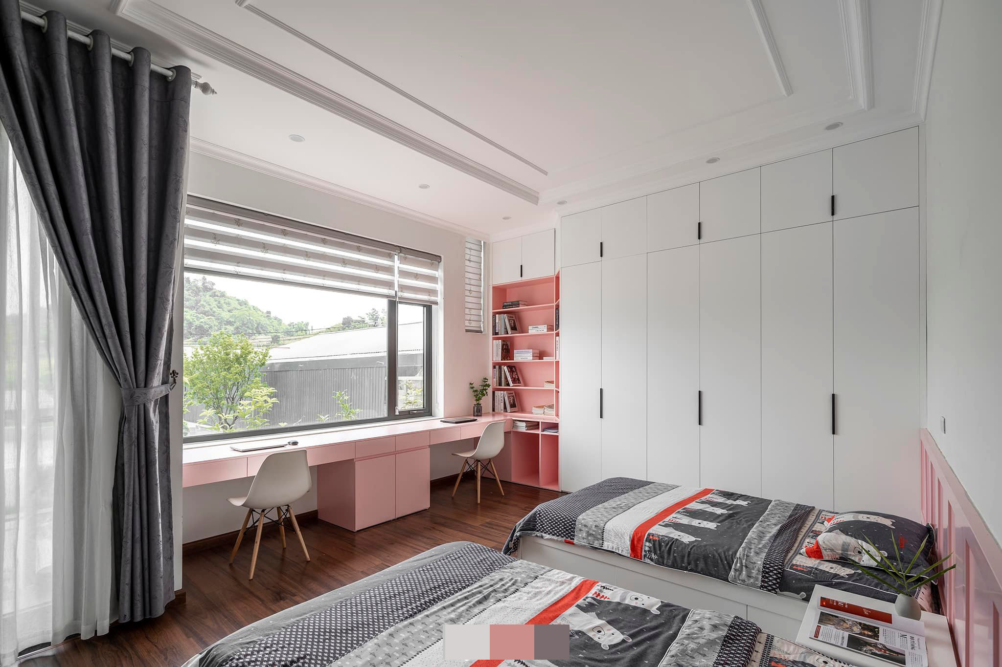Phòng ngủ của 2 bé gái tone màu hồng pastel kết hợp màu trắng, bàn học nhìn ra sân trước thoáng đãng.