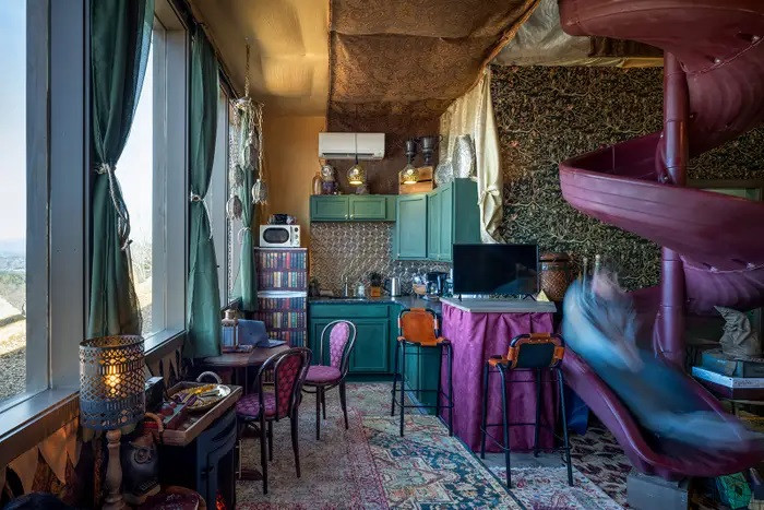 Sau đó, các vị khách sẽ nhìn thấy một chiếc cầu trượt để xuống căn hộ thực sự.