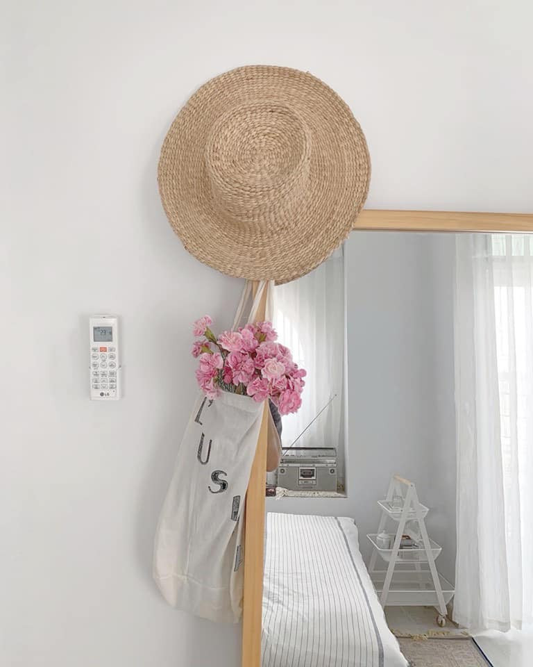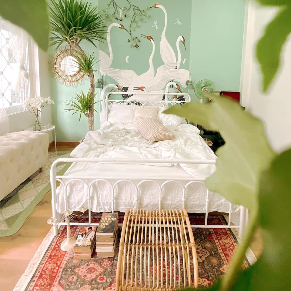 Nhà có 5 phòng ngủ, mỗi phòng chị Lan decor theo 1 kiểu nhưng mang chung phong cách vintage lãng mạn. Gam màu trắng là chủ đạo và dùng màu vàng, xanh lá hoặc hồng làm điểm nhấn. Màu sắc phân bố hợp lý với 60% là màu chủ đạo, 20% màu nhấn và 10% màu trung hòa.