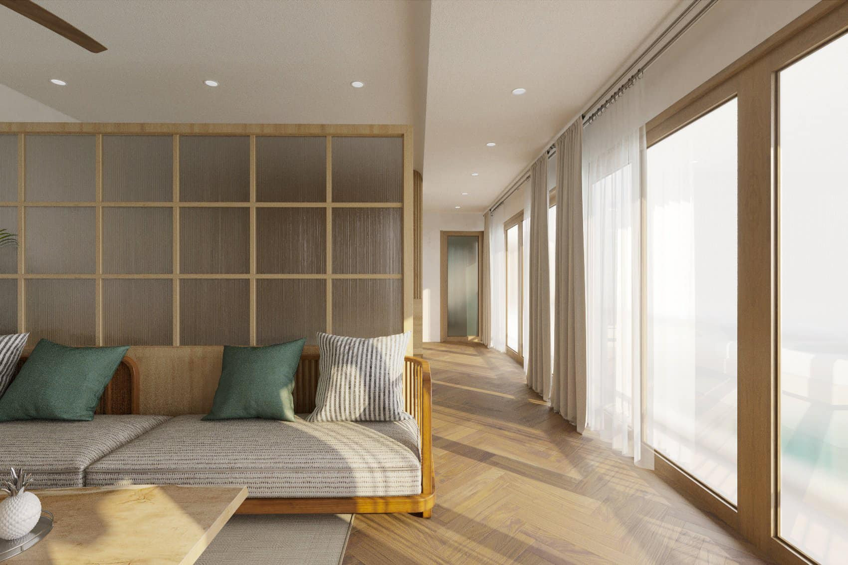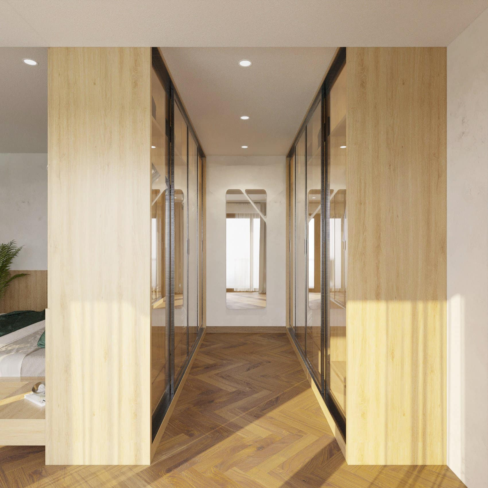 Ở đây tạo thành không gian mở, liên kết phòng ngủ, phòng khách và phòng thay đồ.