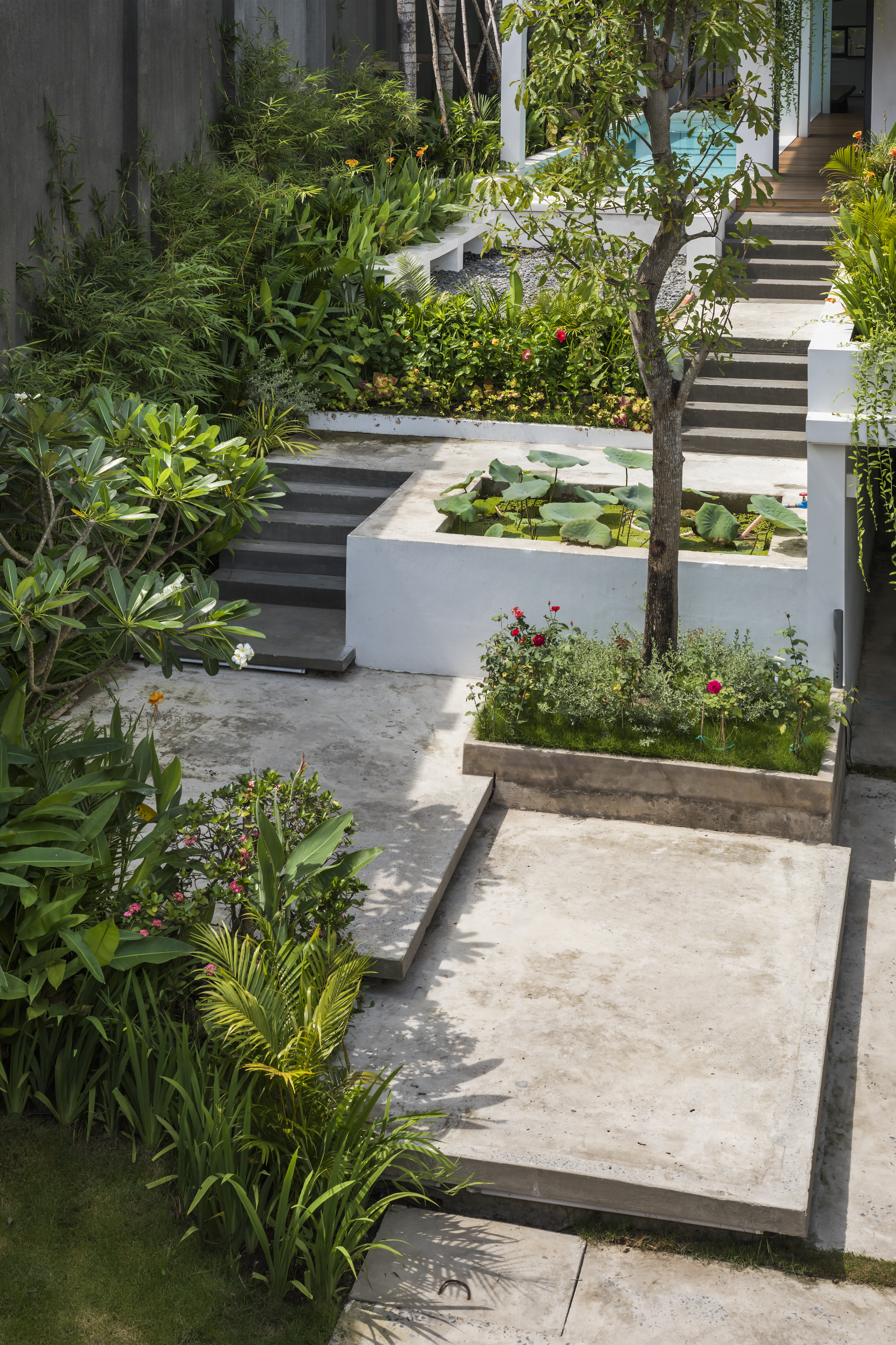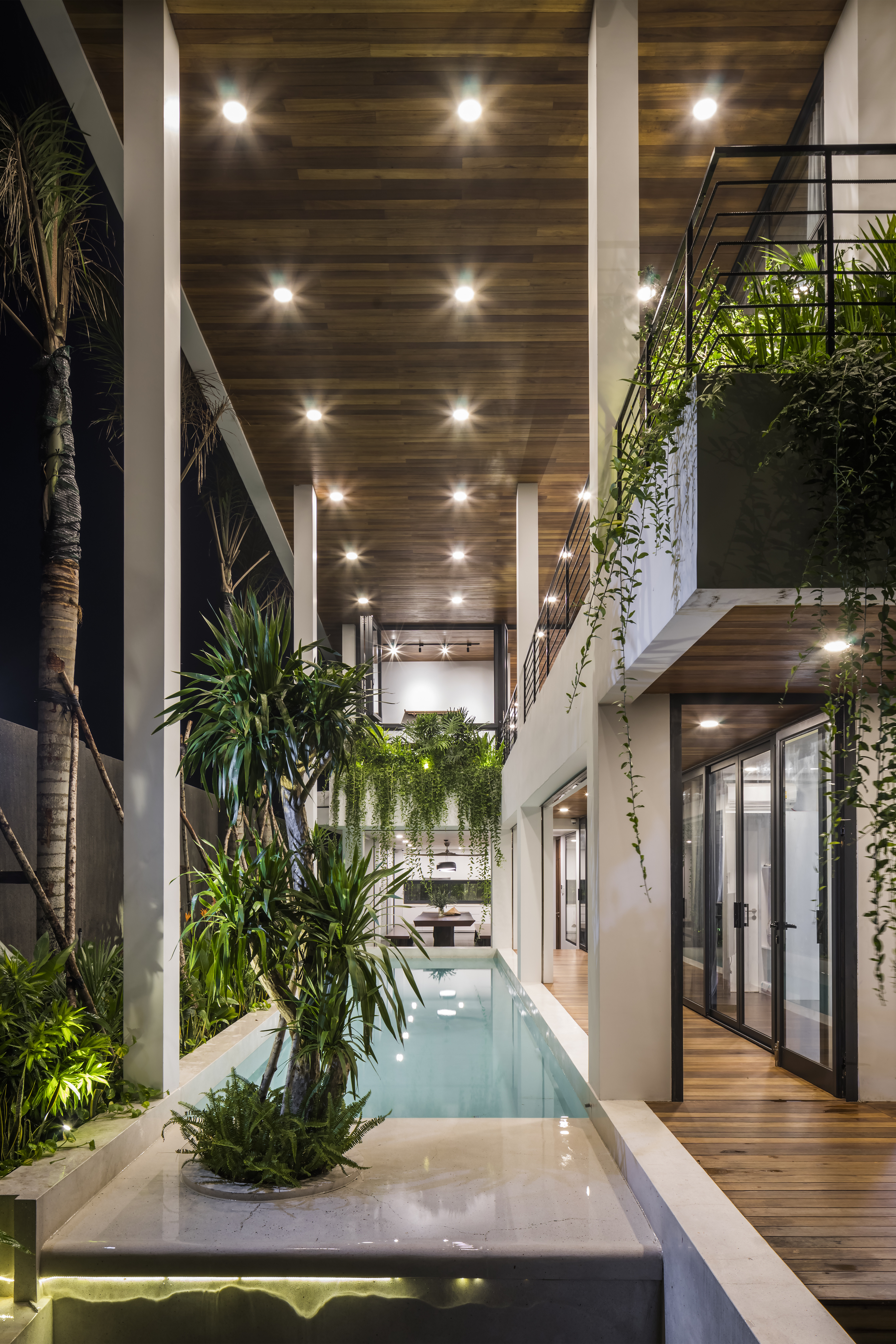 Dọc theo chiều dài nhà là bể bơi có kích thước 4x16m được bố trí cùng mảng cây xanh cao. Việc đặt hồ bơi tại vị trí này phát huy khả năng liên kết các không gian sinh hoạt theo chiều cao và chiều đứng.