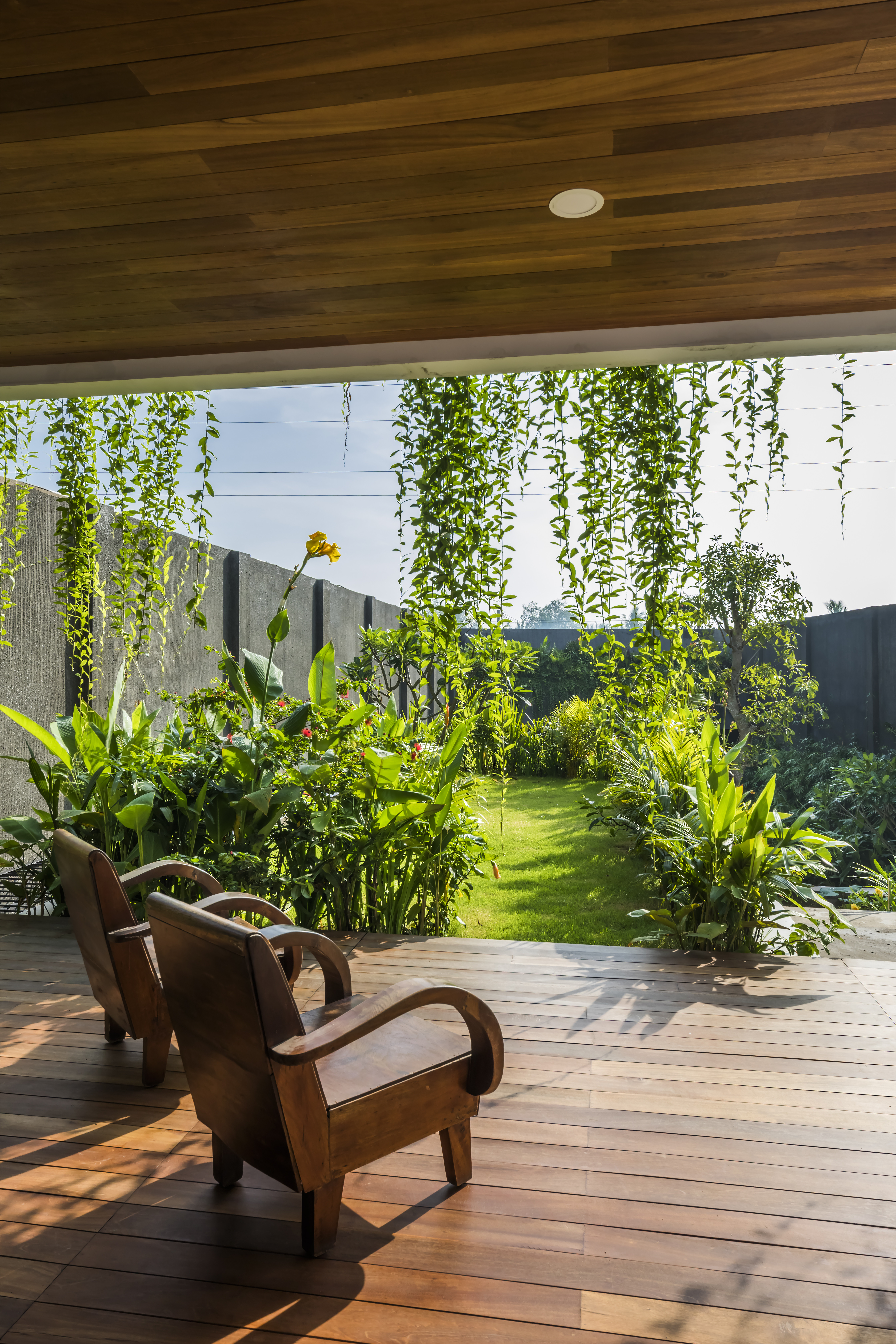 Ngay khi bước vào khu vực bên trong nhà, phòng ngủ với lớp cửa kính lớn hiện ra, có mảng sân trên cao riêng biệt và view nhìn ra hồ bơi cùng sân chính. Hàng hiên rộng tạo thành nơi để ngồi chơi hóng mát, thư giãn vào mỗi buổi chiều.