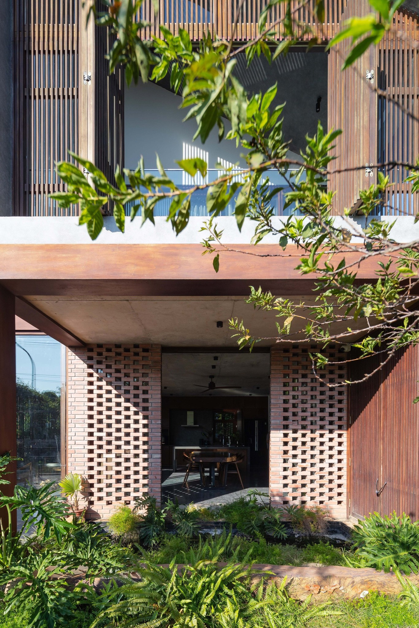 Ngôi nhà ẩn hiện sau rặng cây xanh mát, mái dốc tránh lắng đọng nước mưa và làm mát nhà. Công trình có 2 lối tiếp cận: Lối tiếp cận chính với ý đồ dẫn dắt người đi di chuyển nhiều hơn và trải nghiệm toàn bộ không gian cảnh quan cho tới một không gian sảnh chính lớn với hàng hiên dài, tái hiện kiến trúc nhà ba gian truyền thống Việt Nam. Sảnh chính còn là điểm nhìn bao quát của giao thông trong công trình. Lối thứ 2 dành cho gia chủ đang ở phía bên trong nhà có thể di chuyển ra cổng hay sân vườn 1 cách thuận tiện.