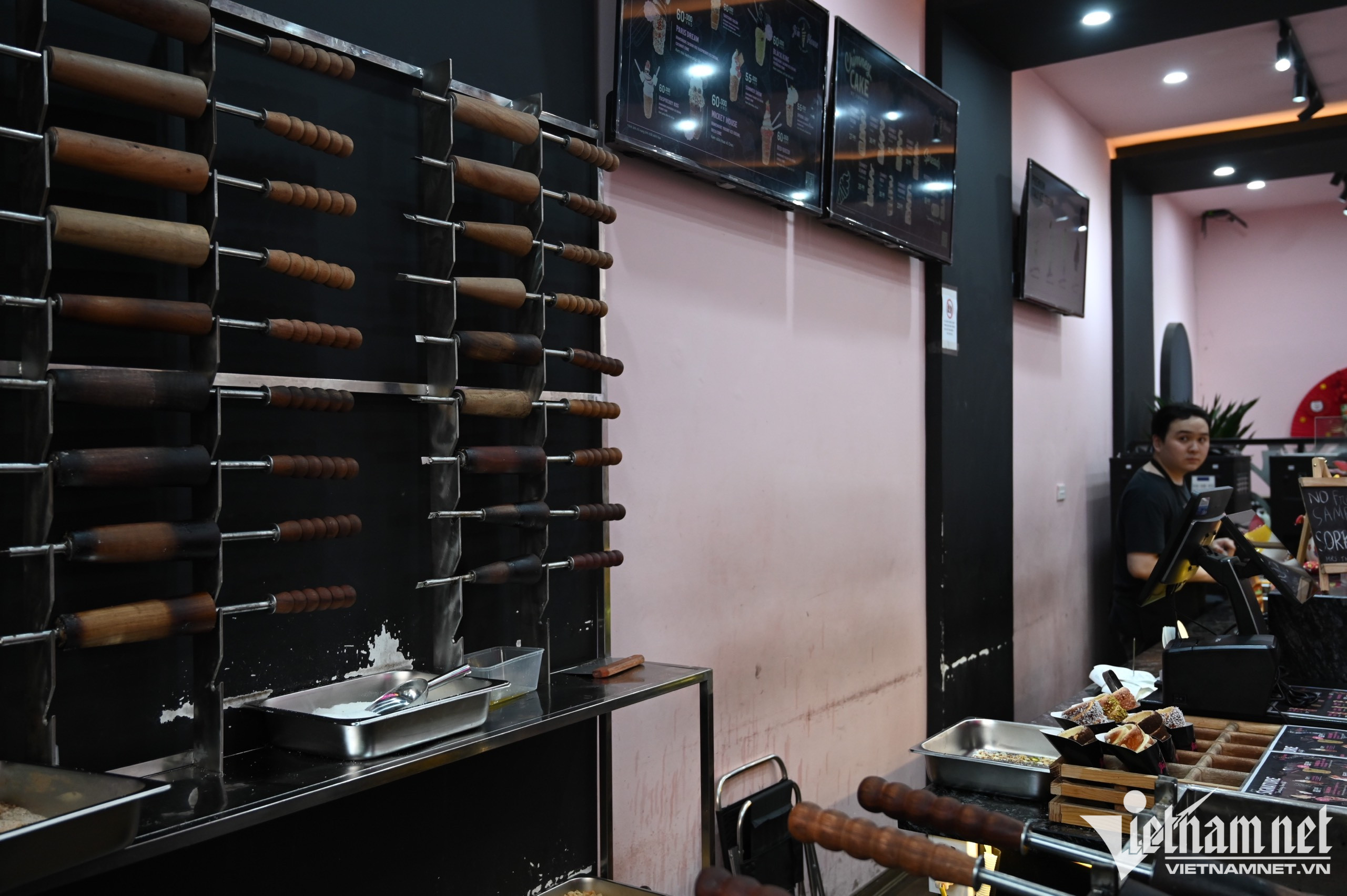 Tại đây, thiết bị và dụng cụ làm bánh khói được đặt ngay gần khu vực tiếp khách. Trụ nướng bánh có chiều dài 70-80cm, bán kính 7cm-8,5cm được xếp ngay ngắn trên các giá đựng trong cửa hàng.