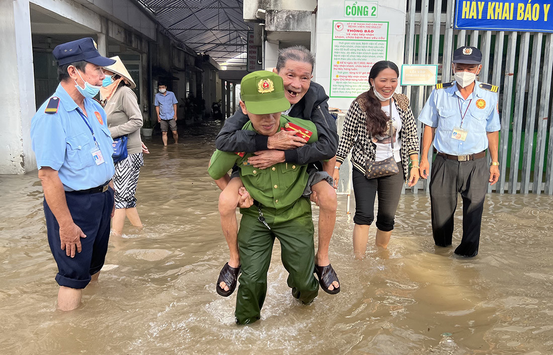 Sáng nay, cụ ông Trần Hồng Phương (92 tuổi, ngụ quận Ô Môn) được người nhà chở xuống quận Ninh Kiều khám bệnh. Do đường ngập sâu xe không thể chạy được, Thượng úy Nguyễn Thành Thắng (Công an phường An Nghiệp, quận Ninh Kiều) lập tức cõng cụ Phương vượt "biển nước" sang Bệnh viện Tim mạch để khám bệnh.