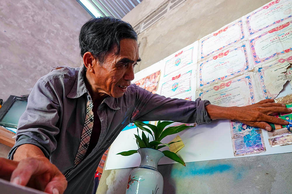Ngôi nhà nhỏ của ông Mai Ngọc Tuyết (57 tuổi), nằm tại phường 7, TP Vị Thanh, Hậu Giang, không có vật dụng gì đáng giá ngoại trừ những tấm giấy khen của em Mai Khánh Tân (21 tuổi, con trai ông Tuyết), được dán trên tường.