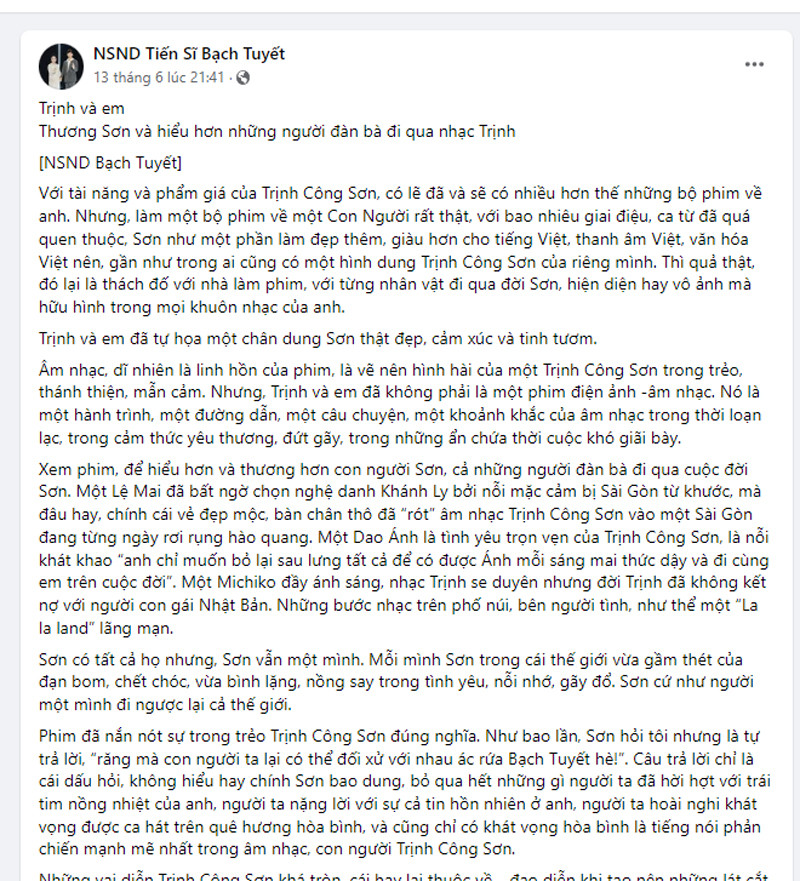 Một trong những bình luận đáng chú ý về phim “Em và Trịnh” là một “khán giả thế hệ trước” - NSND Bạch Tuyết. Bà còn là hàng xóm của ông, đón ông “gầy độ” ở sân nhà cùng chồng và các con. NSND Bạch Tuyết xúc động chia sẻ trên trang cá nhân: “Bộ phim đã tự họa một chân dung Sơn thật đẹp, cảm xúc và tinh tươm. Âm nhạc, dĩ nhiên là linh hồn của phim, là vẽ nên hình hài của một Trịnh Công Sơn trong trẻo, thánh thiện, mẫn cảm”.
